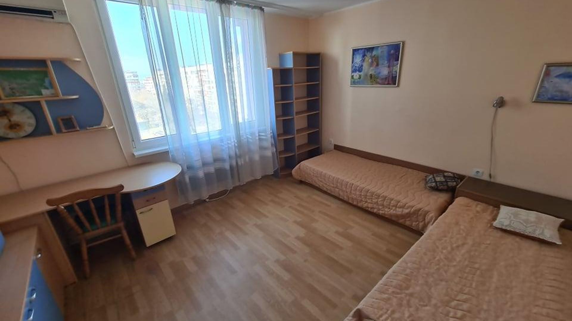 <br/>Имотът е ситуиран на 7-ми жилищен етаж и разполага с площ 100кв.м, разгърната в следното разпределение: коридор, хол, кухня с всекидневна и обща дълга тераса с прекрасен изглед към Бургас, детска стая, спалня с тераса, отделна баня с вана, самостоятелна тоалетна и мокро помещение.