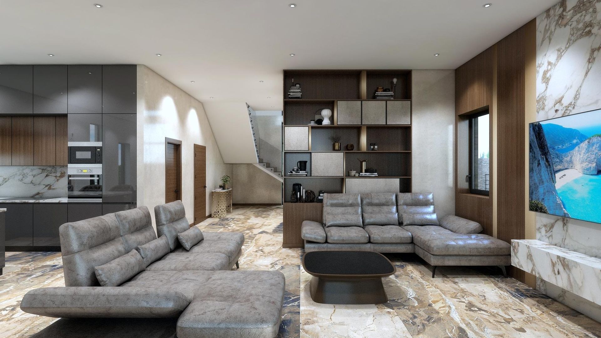 <br/>-първи етаж : четири големи спални, от които две са със самостоятелни бани и излаз към панорамен балкон с гледка към залива. За другите две спални има предвидена допълнителна баня с WC и мокро помещение, към едната спалня има още един балкон.