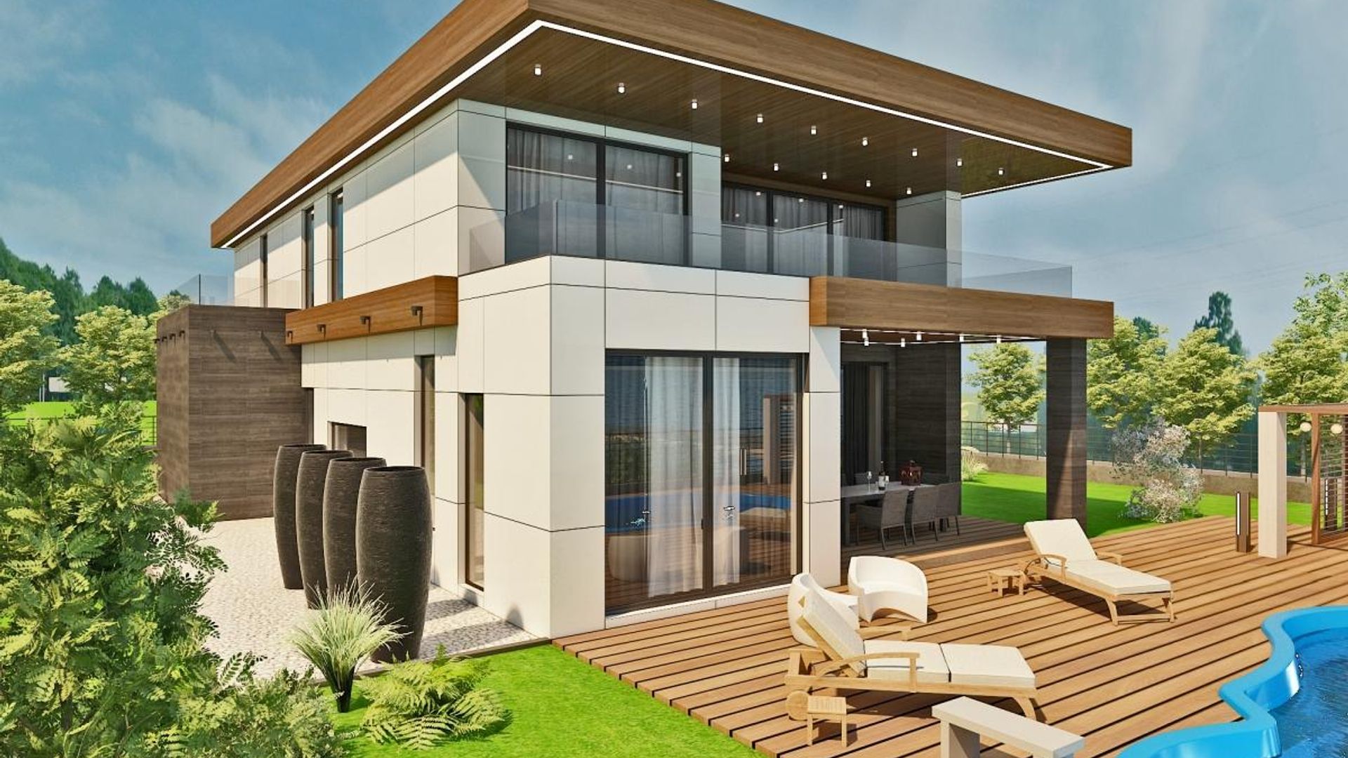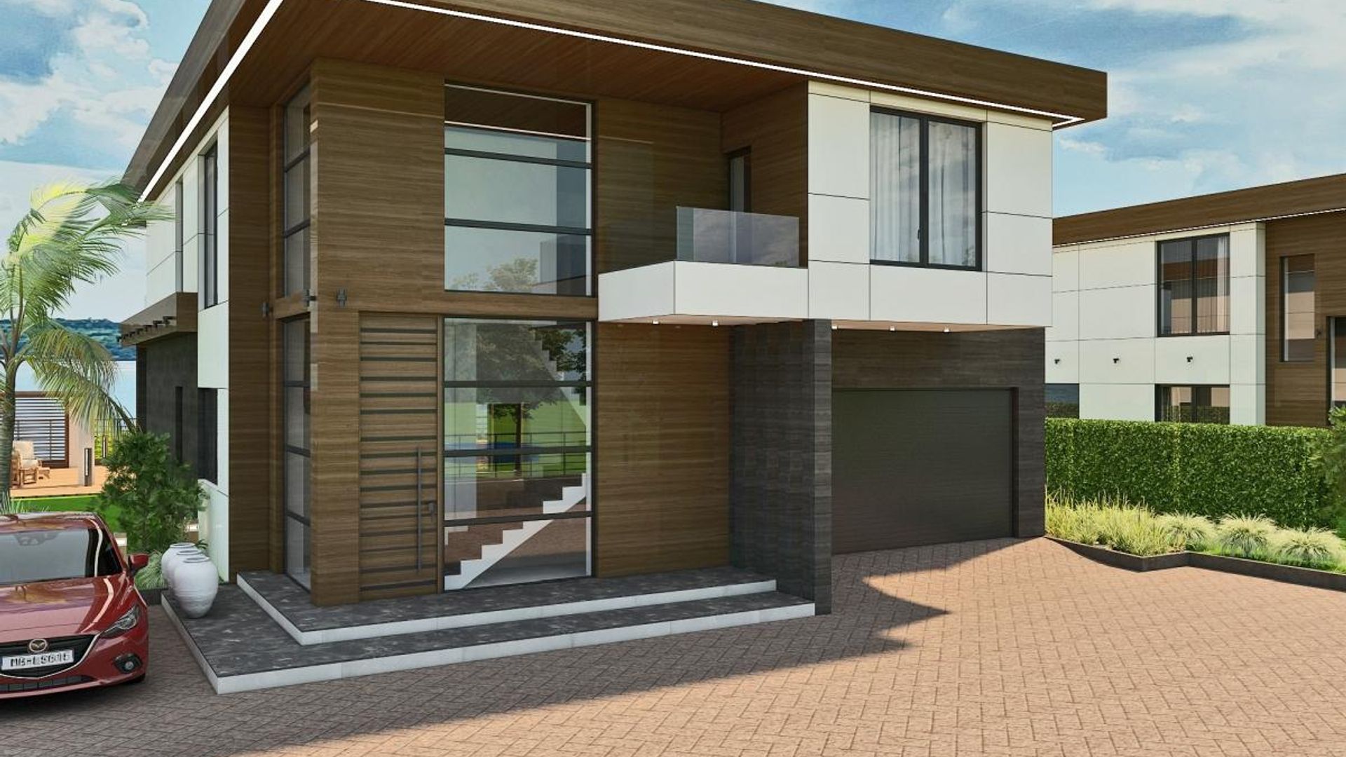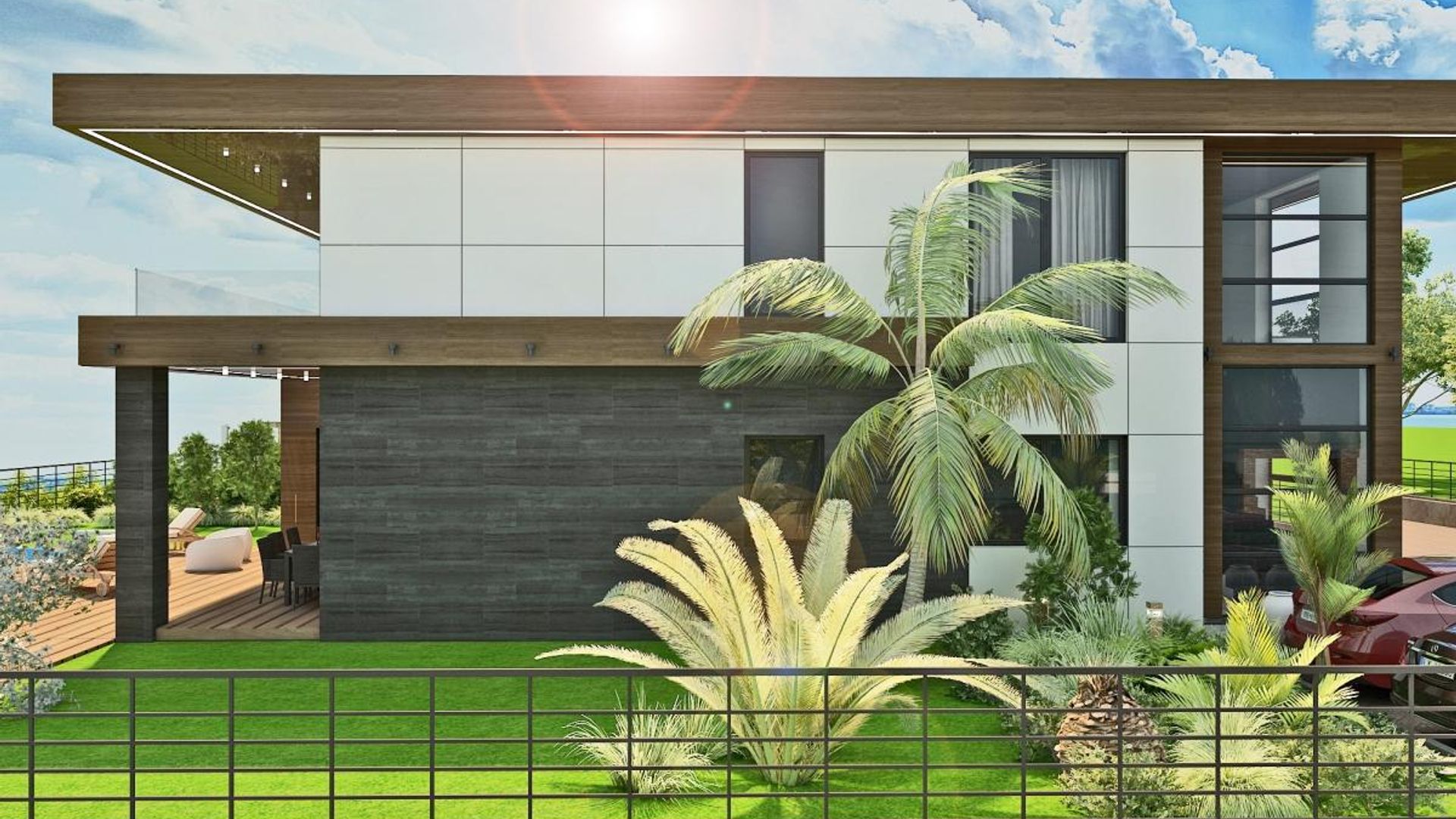 <br/>И трите типа къщи са с идентична архитектура в модерен стил с плосък покрив, за да има възможност за поставяне на соларни панели, богато остъкляване посредством най-добрите алуминиеви системи, високи тавани, врати и прозорци, много отворени пространства в партерния етаж.