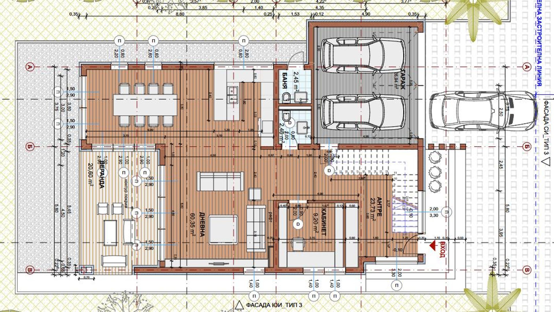 <br/>-партер: входно антре с просторна дневна с кухня и трапезария, помещение за кабинет или допълнителна спалня за гости, гараж, прекрасна веранда към задния двор, място за поставяне на басейн, беседки, външни кухни, зимна градина и др.