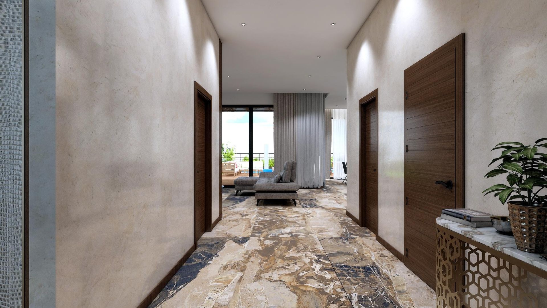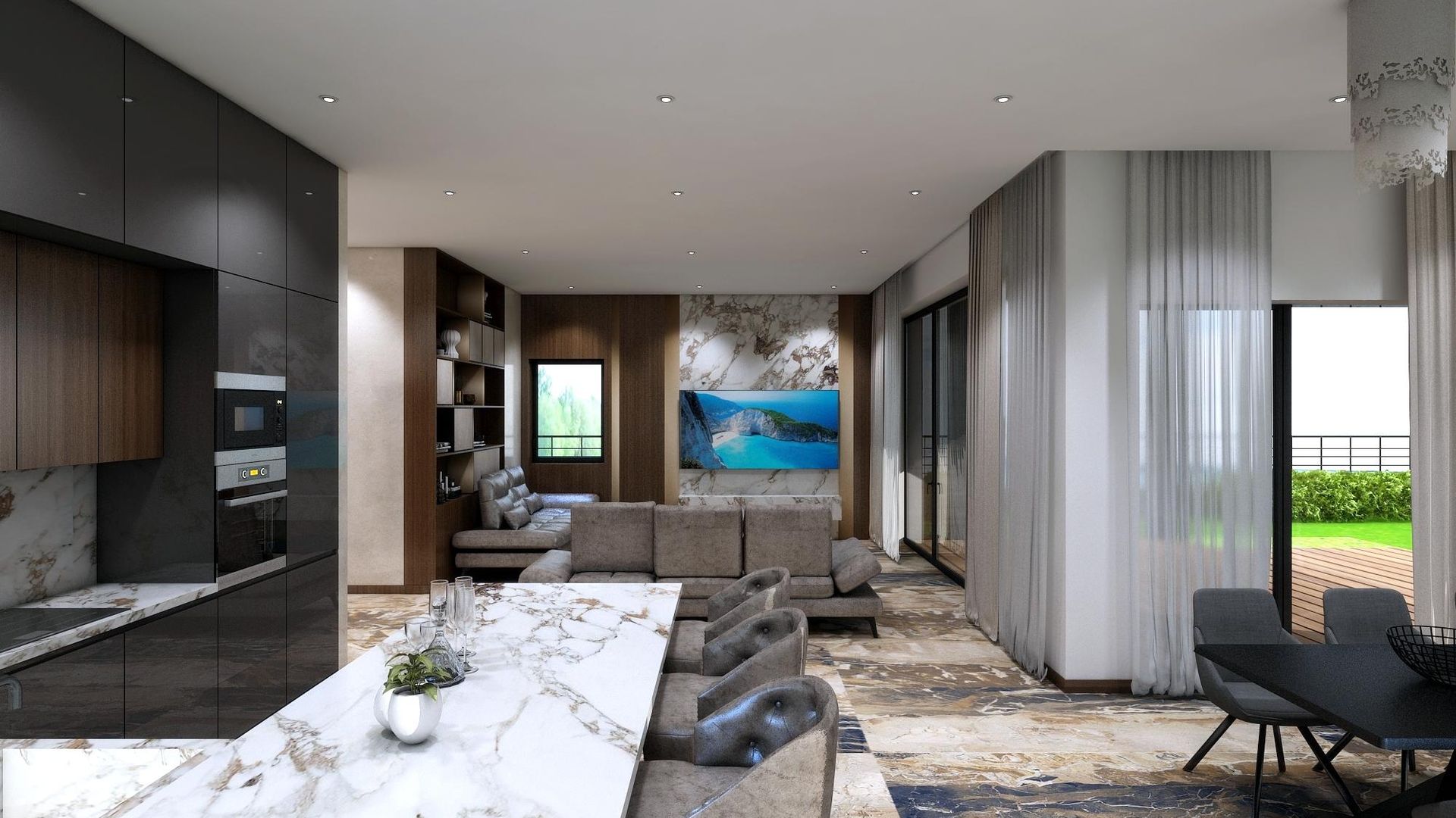 <br/>Задните дворове са изцяло позиционирани с гледка към бургаския залив, богато озеленени с покрити веранди и място за отдих. Възможност за поставяне на басейни, летни кухни, зимни градини и др.