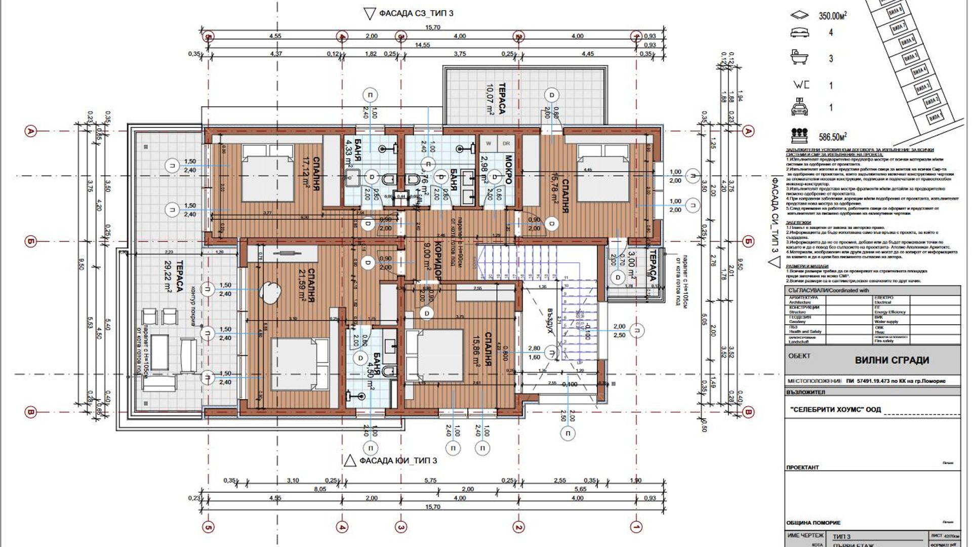 <br/>Проектирани са три типа вилни сгради на два етажа.