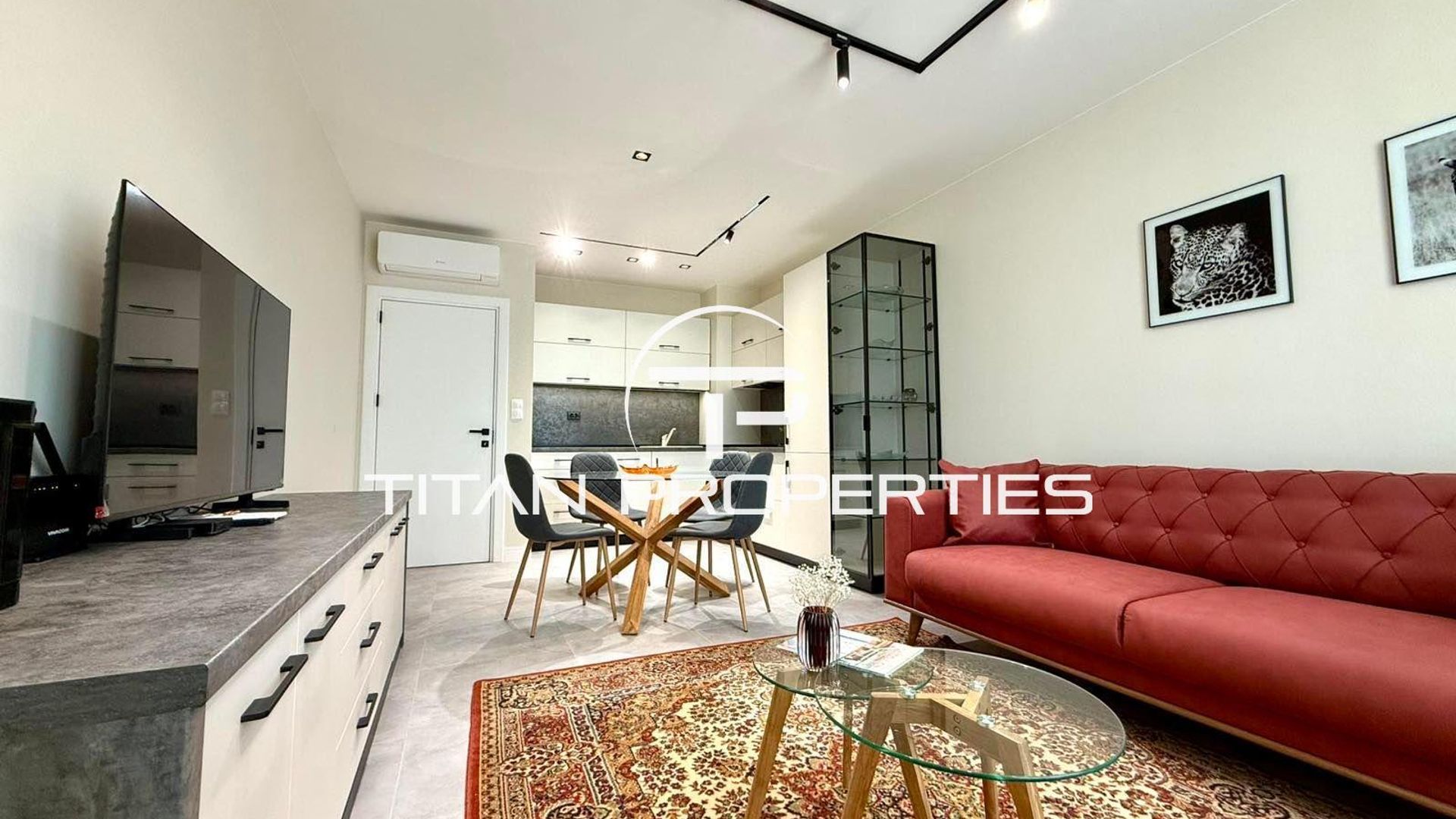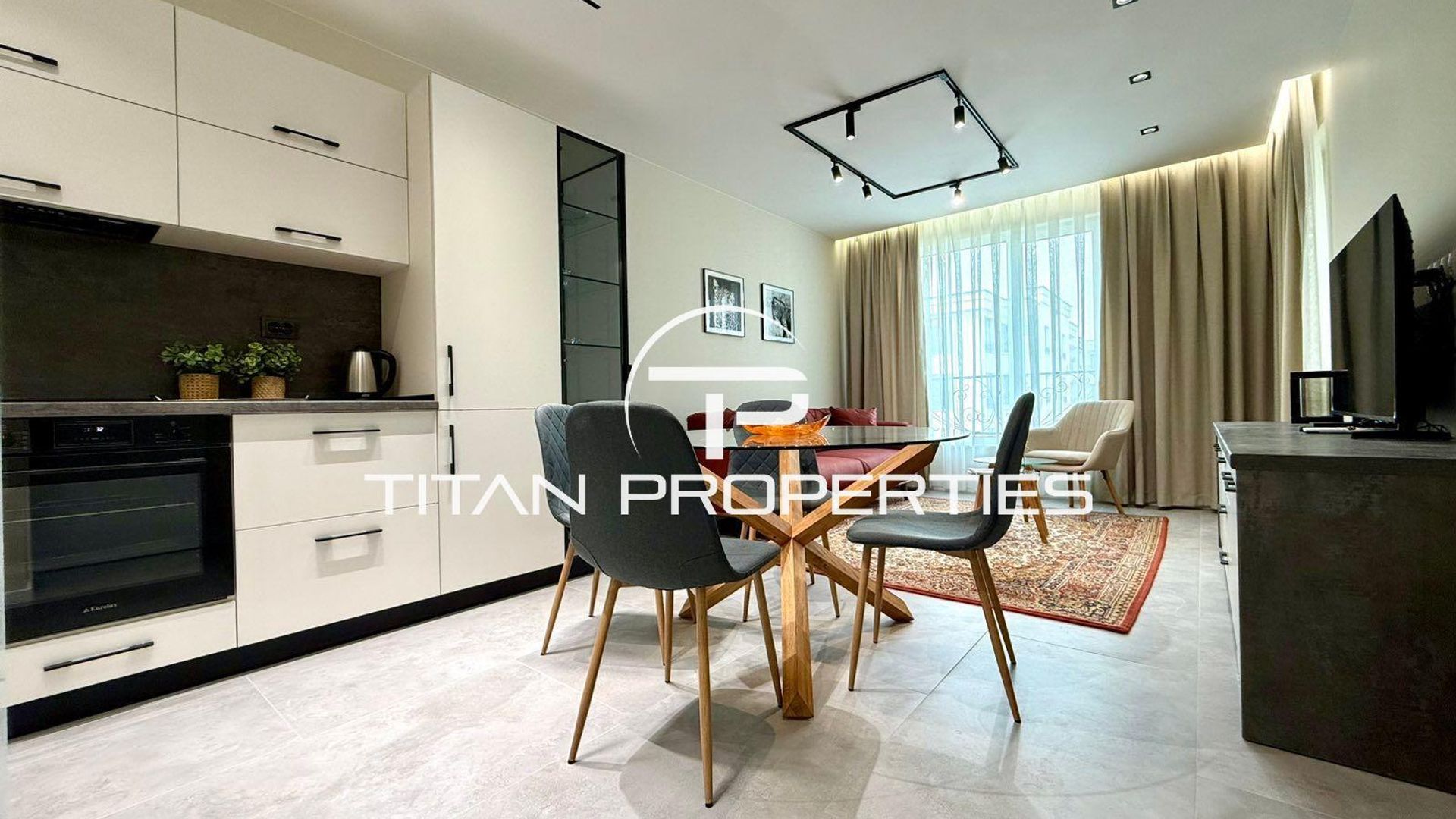 <br/>Дневната зона е светла и просторна, обединяваща хол, трапезария и напълно оборудван кухненски бокс. Пространството е обзаведено с елегантен диван в топъл цвят, модерна стъклена маса и стилен персийски килим, които създават уют и усещане за изисканост.