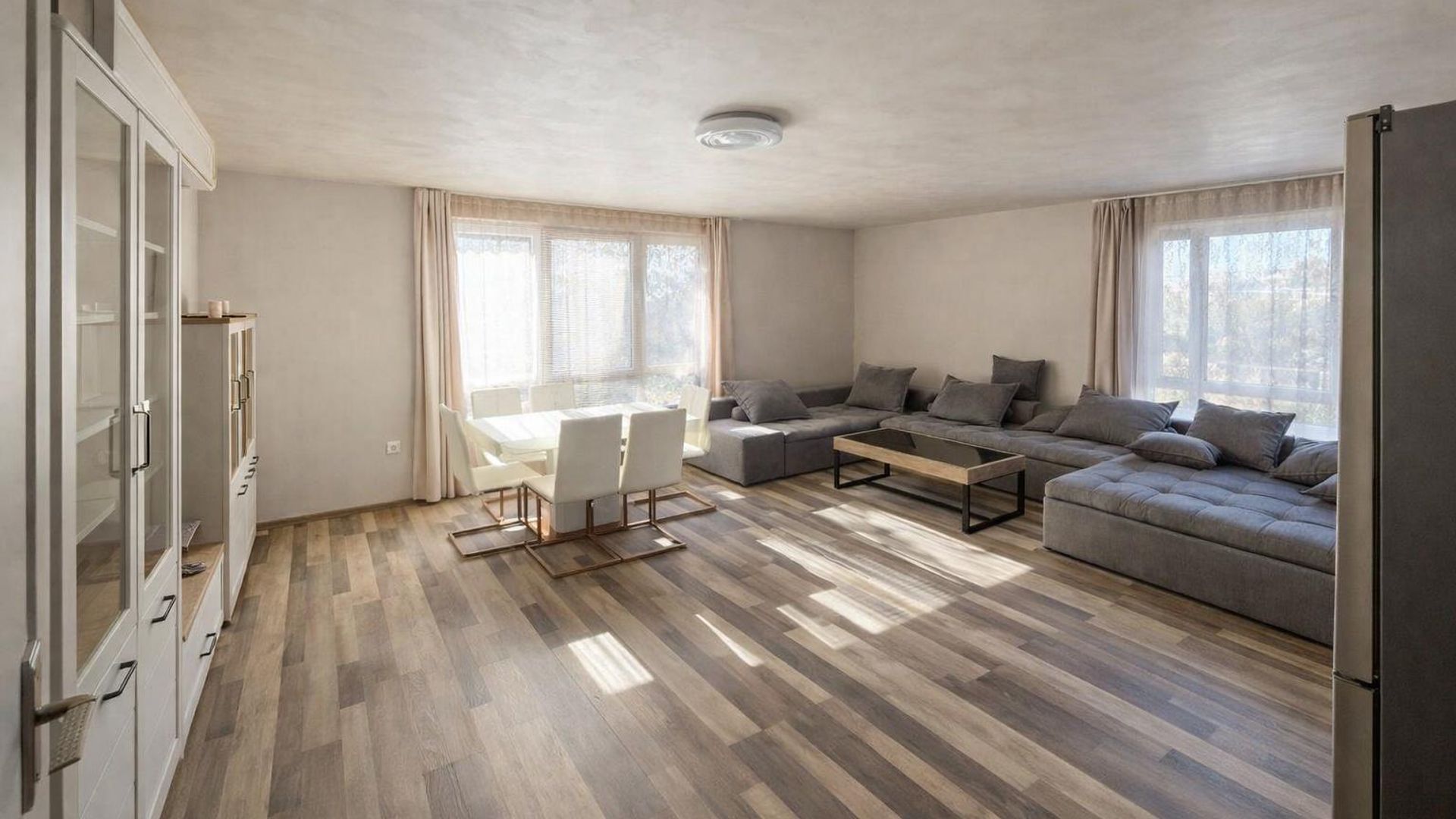 <br/>Имотът е ситуиран на 2-ри жилищен етаж и разполага с площ 153кв.м, разгърната в следното разпределение: входно антре, хол с трапезария и кухненски бокс, три спални, баня с тоалетна, самостоятелна тоалетна и тераса.