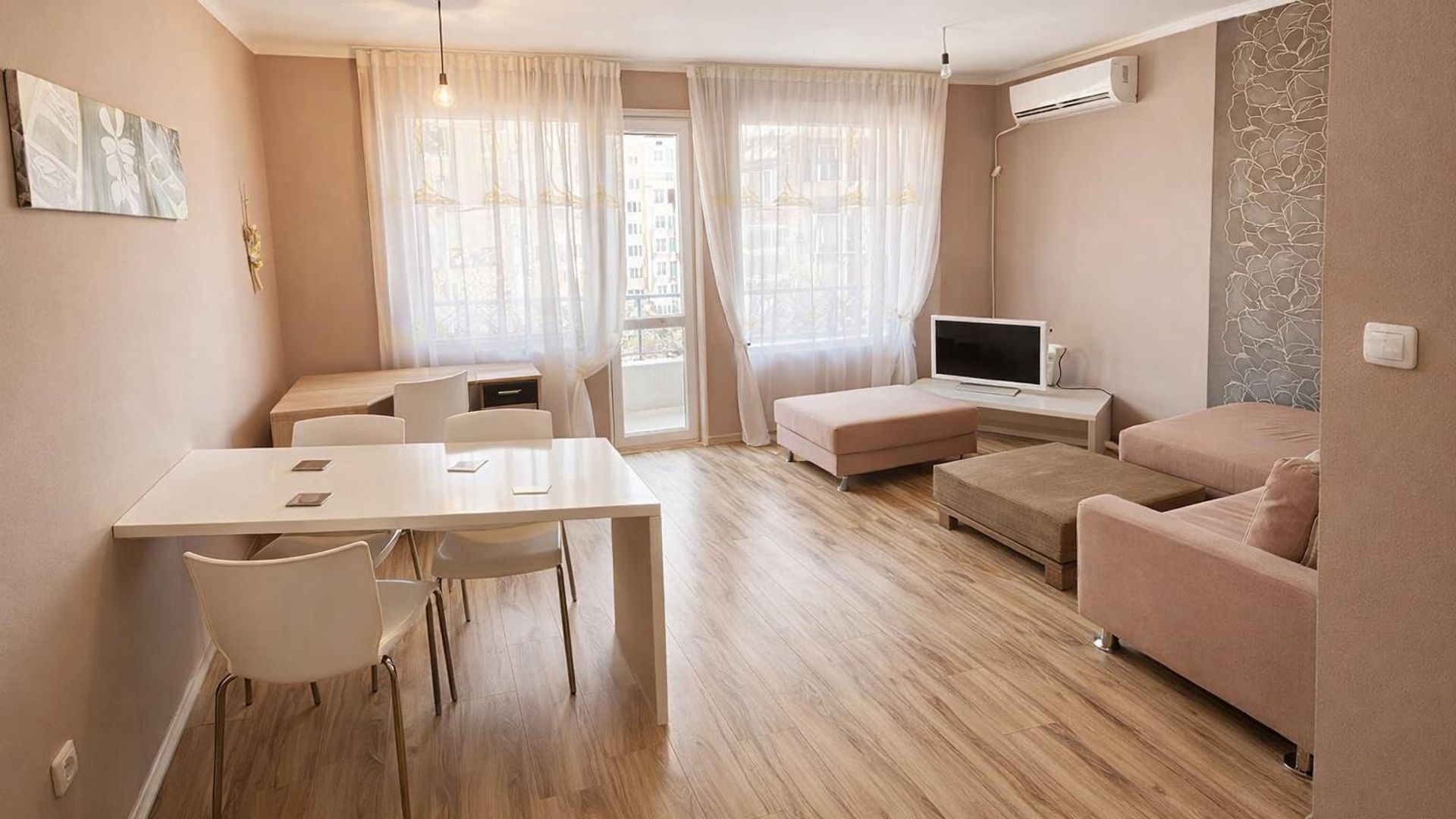 <br/>Компактен двустаен апартамент с функционално разпределение и много светлина. Предлага всекидневна с кухненски бокс, отделна спалня и две тераси за почивка на слънце. Обзаведен и готов за настаняване, с токово отопление и лесен достъп до градски транспорт.