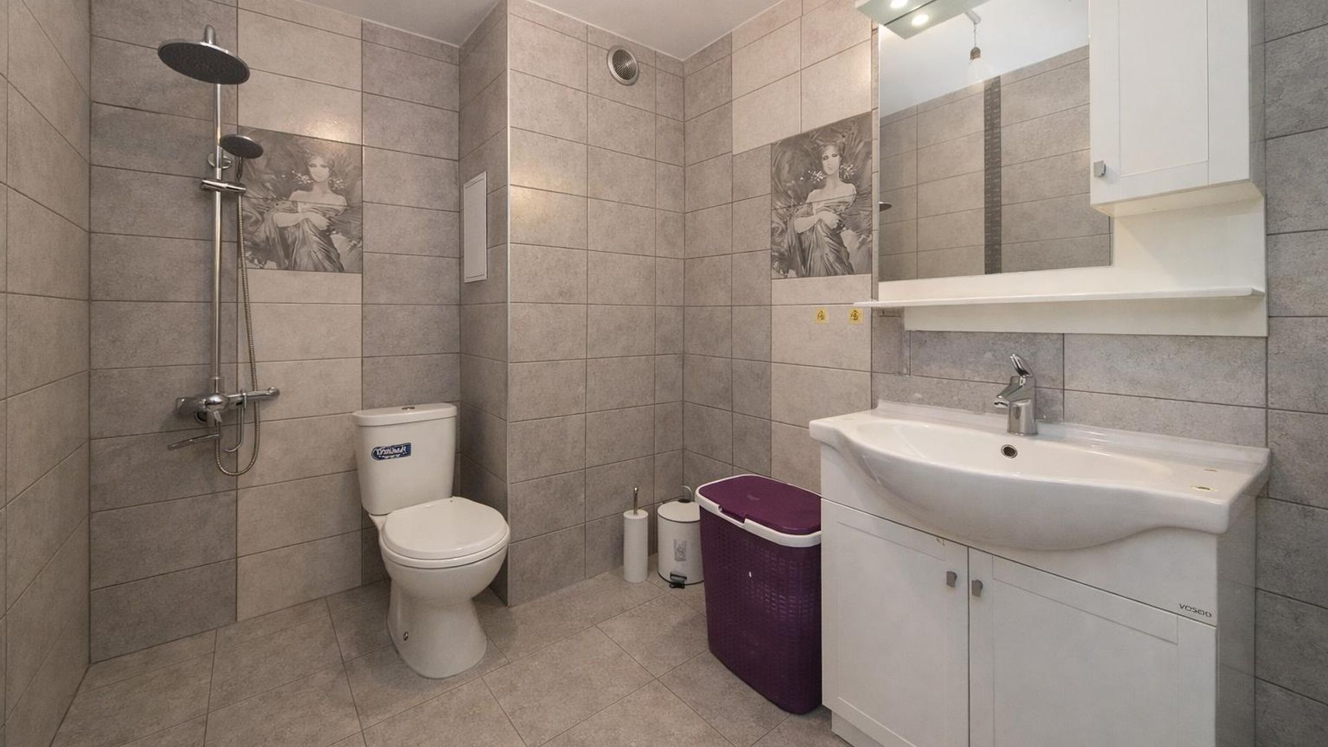 <br/>Имотът е ситуиран на 1-ви жилищен етаж и разполага с площ 85кв.м, разгърната в следното разпределение: входно антре, хол с кухненски бокс, две спални, баня с тоалетна и тераса.
