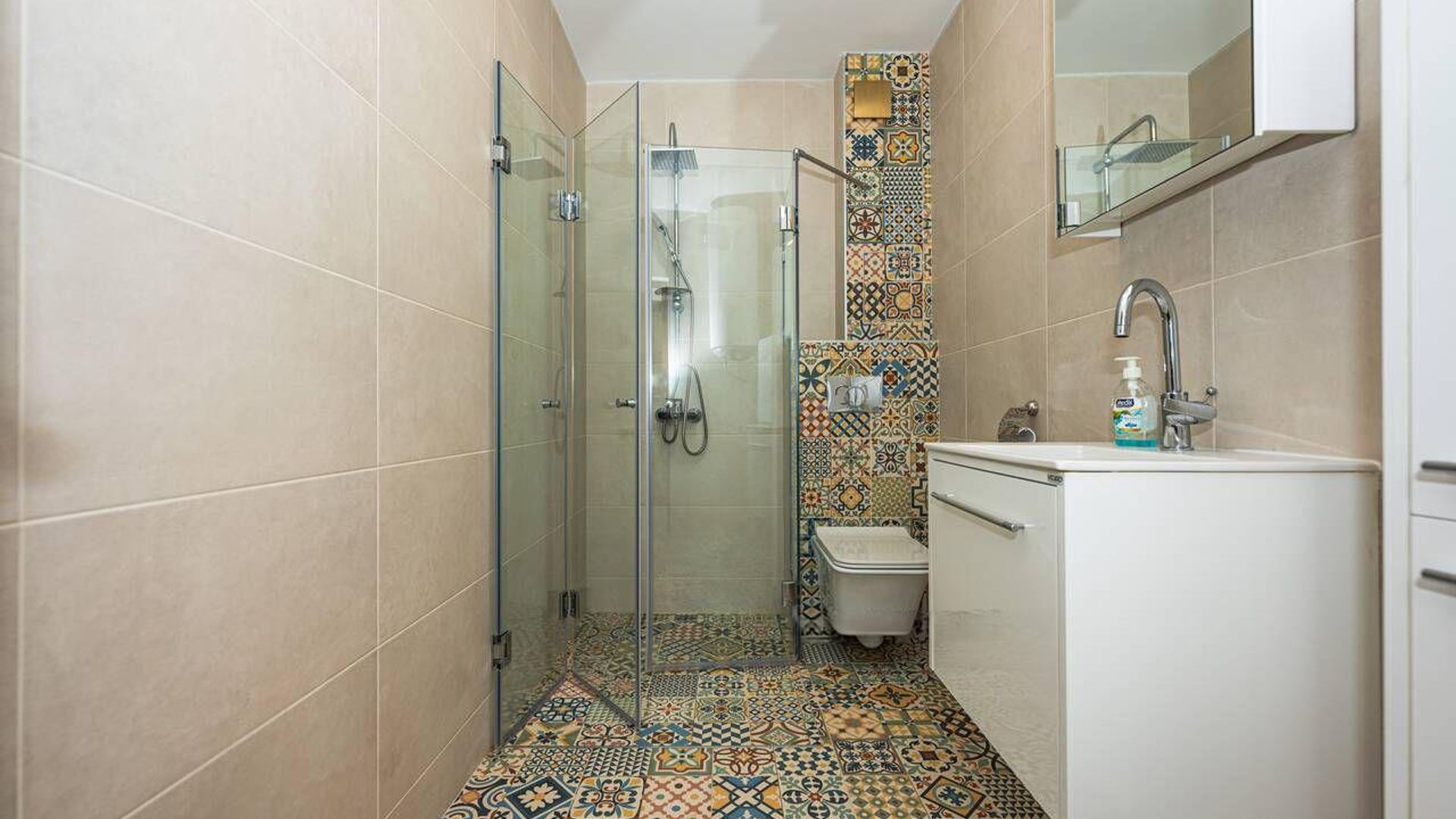 <br/>Имотът е ситуиран на 5-ти жилищен етаж и разполага с площ от 98кв.м. разгърната в следното функционално разпределение: входно антре, хол с кухненски бокс, две самостоятелни спални, баня с тоалетна и душ кабина, втора тоалетна с душ, складово помещение с пералня и тераси към всички стаи. Едната спалня е оборудвана с електрическо бюро и удобен стол, което я прави подходяща и за работен офис.