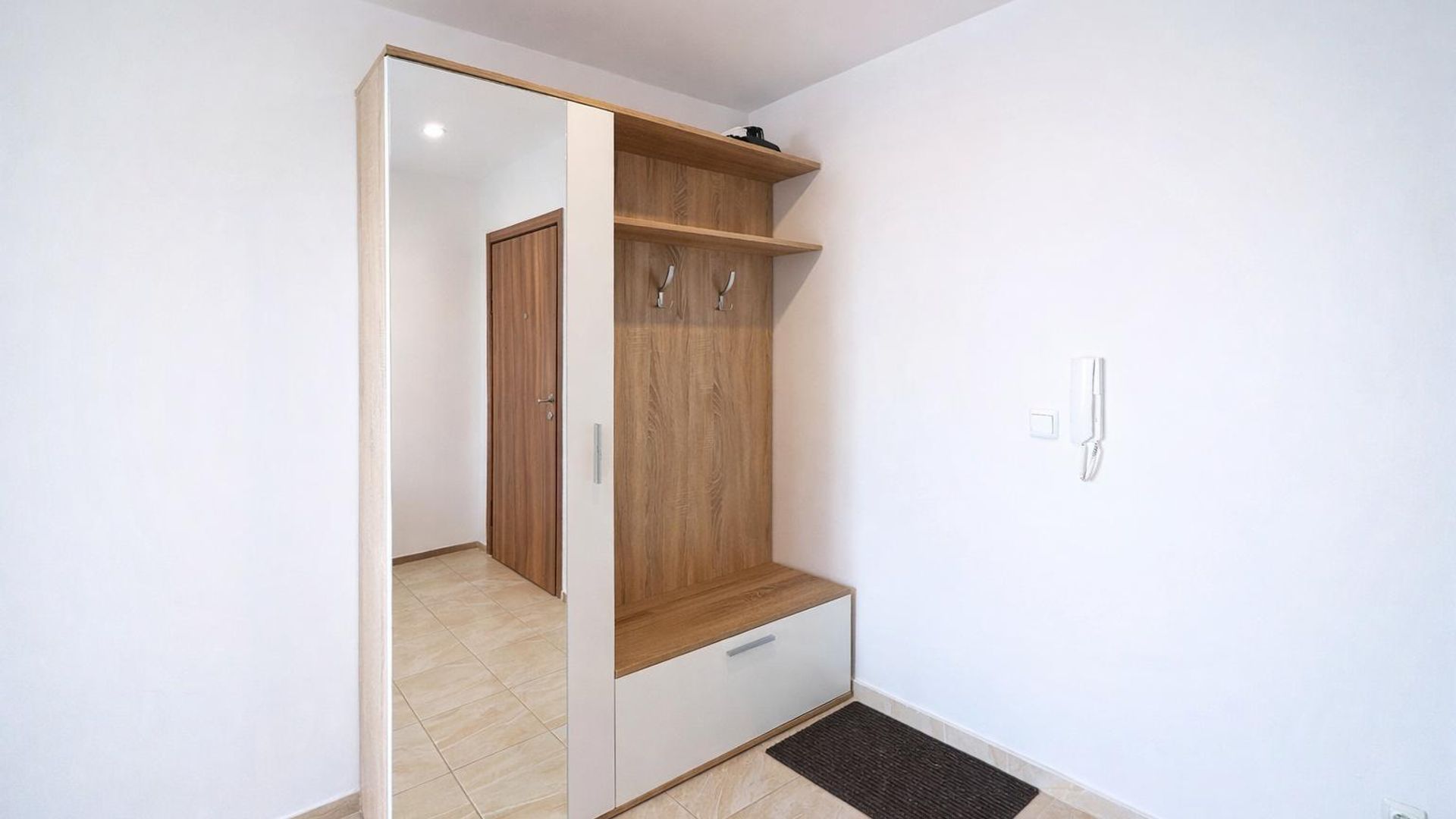 <br/>Имотът е ситуиран на 3-ти жилищен етаж и разполага с площ 65кв.м, разгърната в следното разпределение: входно антре, хол с кухненски бокс, спалня, баня с тоалетна и тераса.