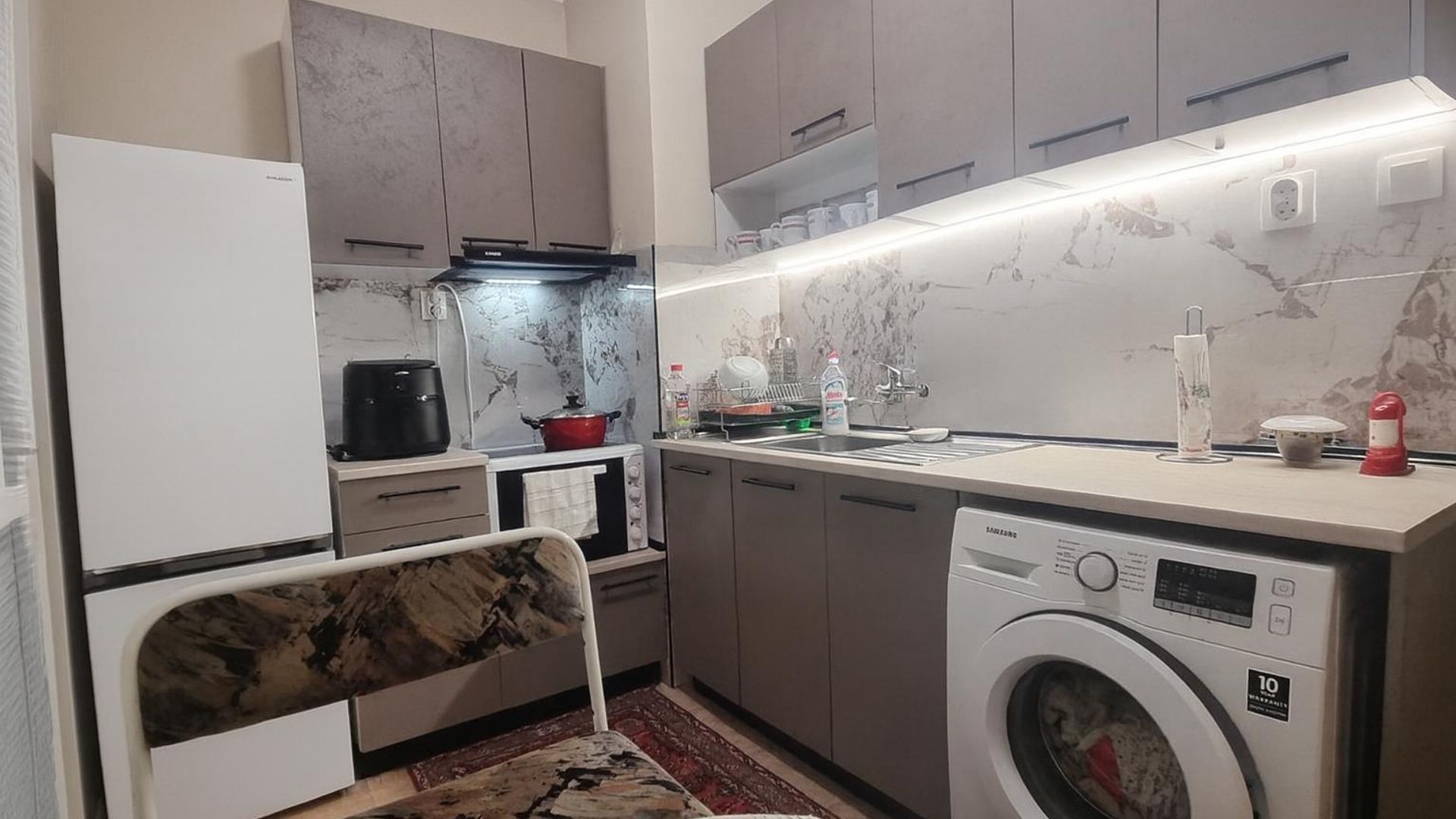 <br/>Жилището разполага с чисто нова кухня, сменена дограма навсякъде и вътрешни ролетни щори, което го прави готово за нанасяне или отдаване под наем. Паркирането в района е свободно.