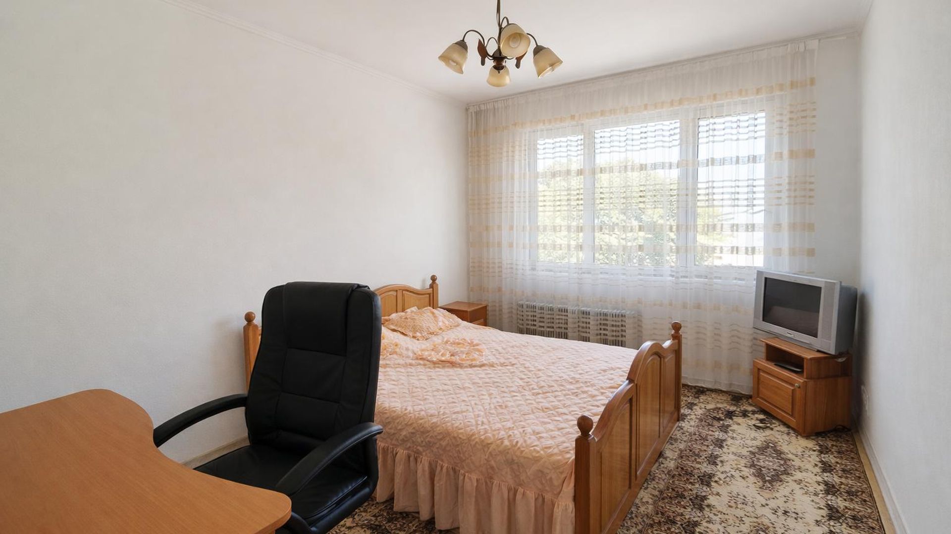 <br/>Жилището е с площ 90 кв.м, разположено на 4-ти етаж от 8 в панелна сграда. Северно/южното изложение осигурява добра светлина през целия ден.