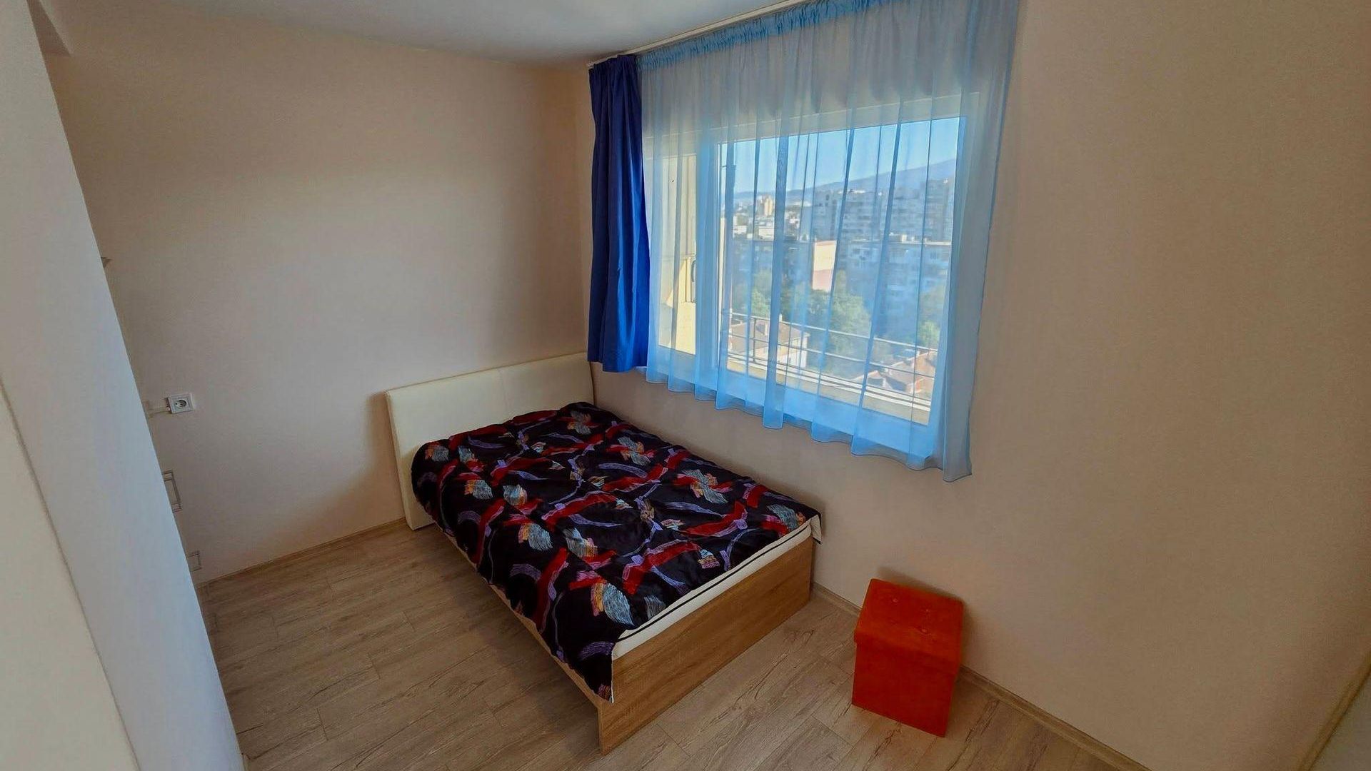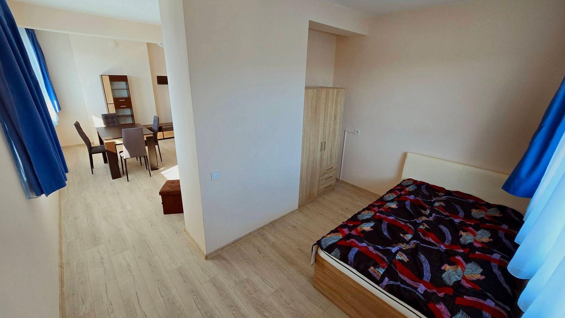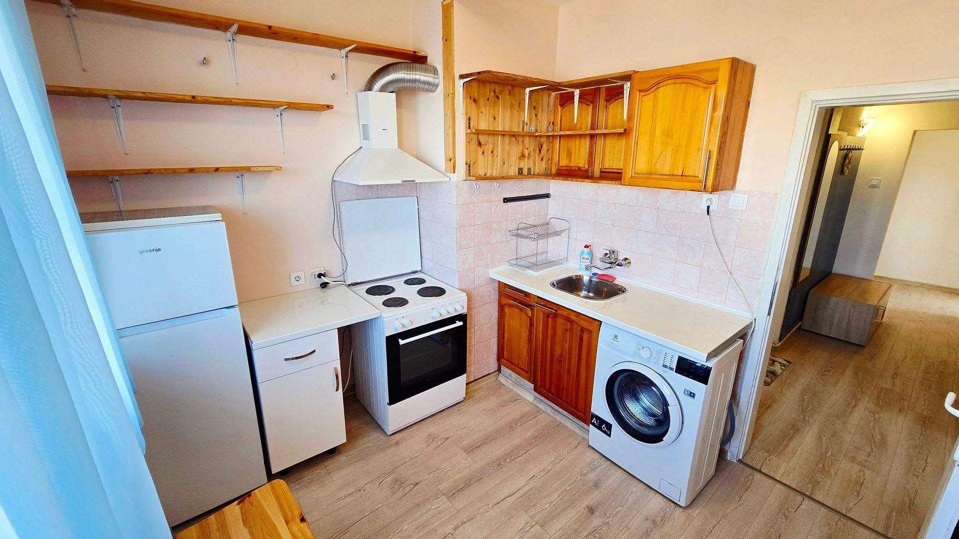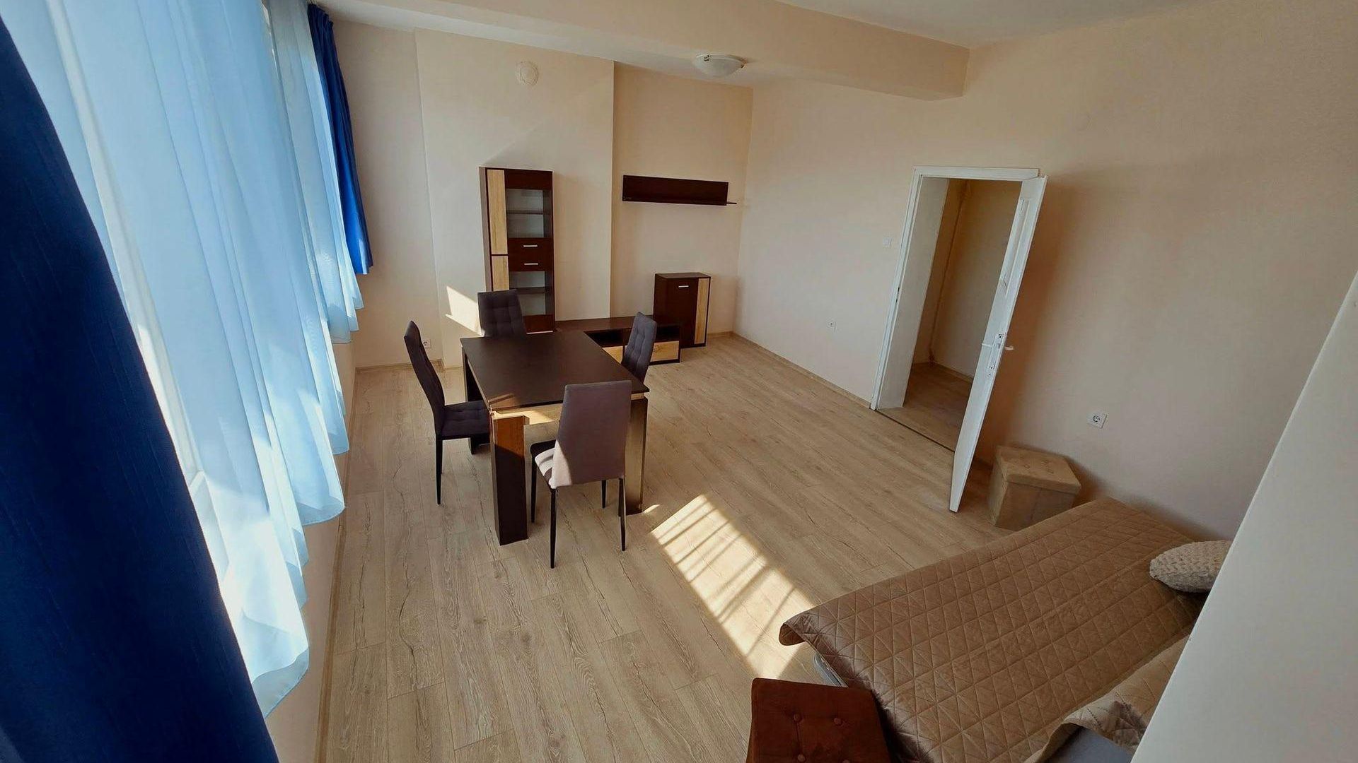 <br/>Разпределението включва хол с кухня, две стаи, баня с тоалетна и тераса. Обзаведен и готов за настаняване, апартаментът разполага с ТЕЦ отопление и климатик за пълен комфорт.