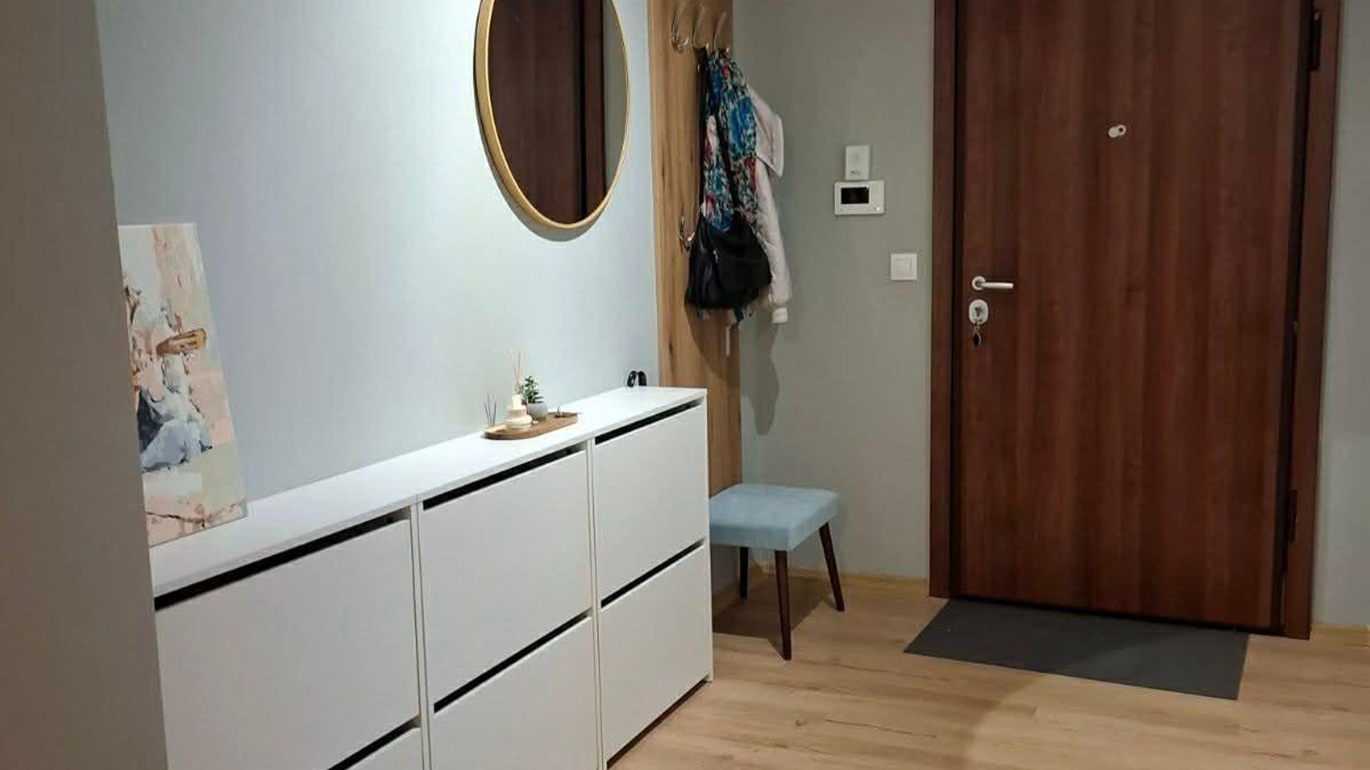<br/>Жилището е с площ 124 кв.м, разположено на 1-ви етаж в нова сграда от 2024 г. Изложението Изток/Запад осигурява отлична естествена светлина.