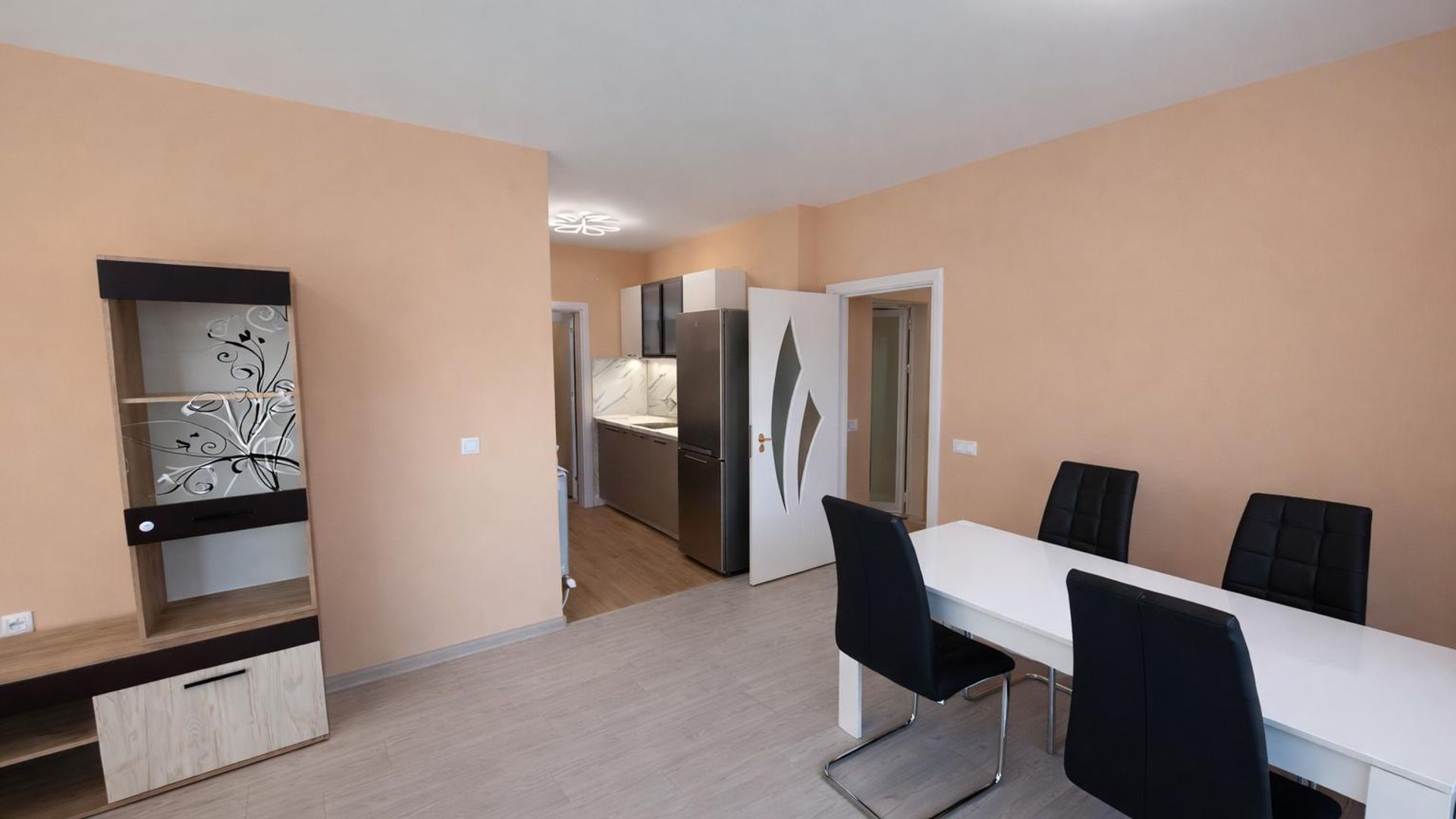 <br/>Разпределението включва хол с кухненски бокс, спалня, баня с тоалетна и тераса. Апартаментът е напълно обзаведен и разполага с централно топлоснабдяване (ТЕЦ).