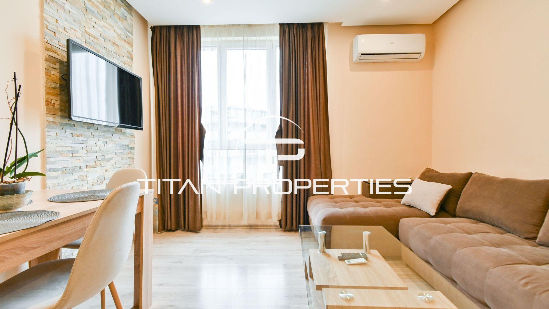 <br/>Апартаментът се предлага напълно обзаведен и оборудван. Отоплява се на ток посредством климатици.
