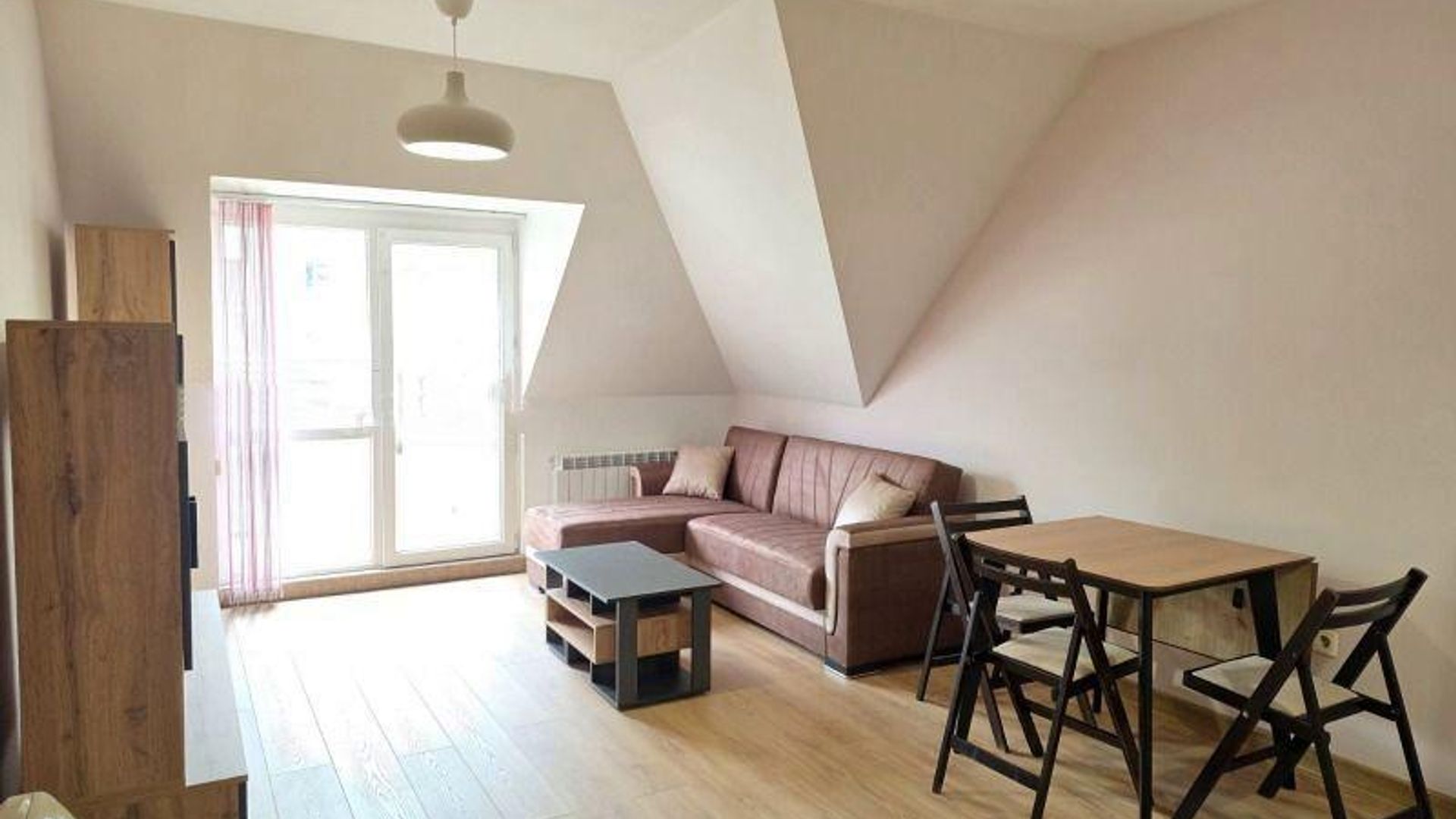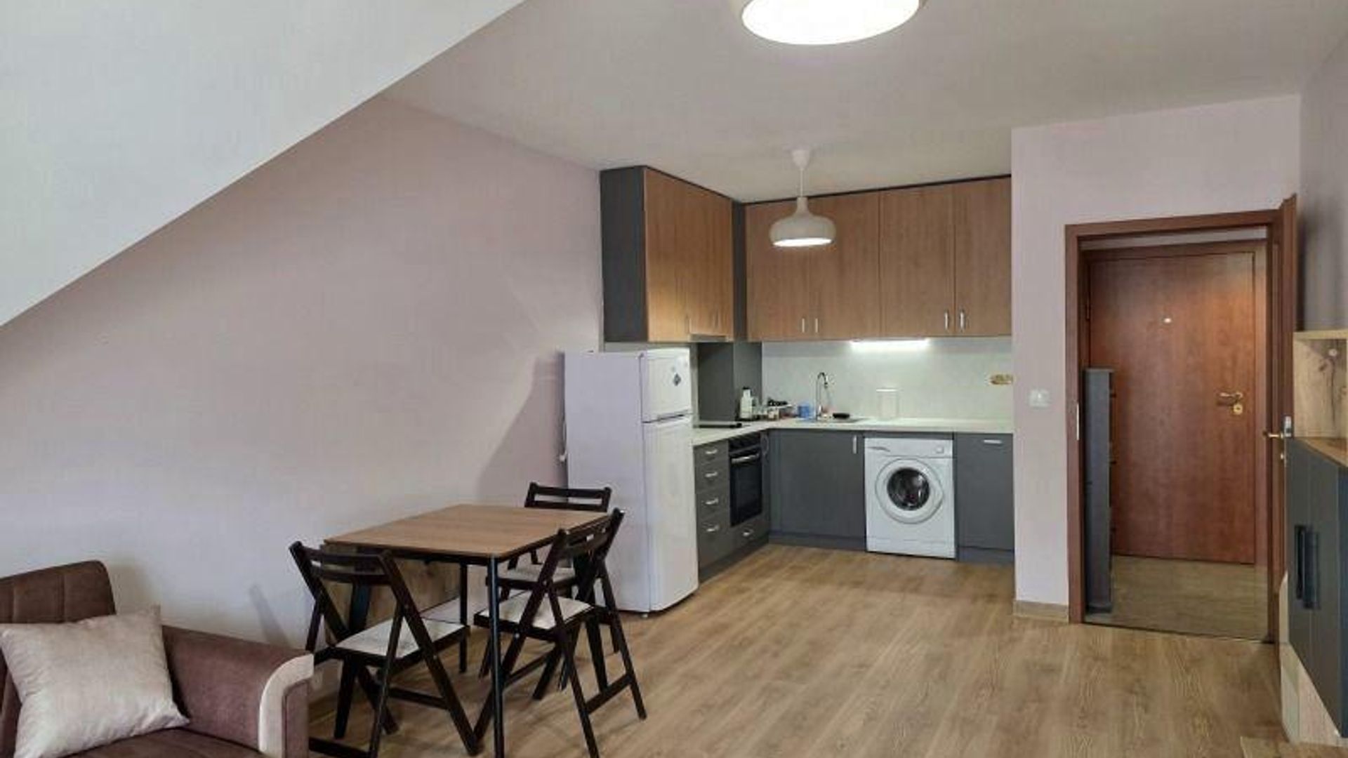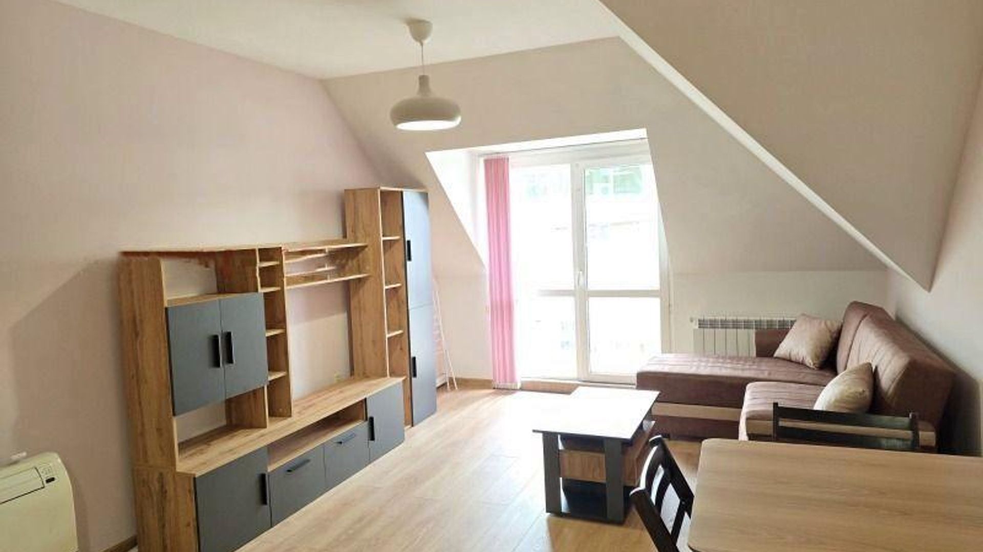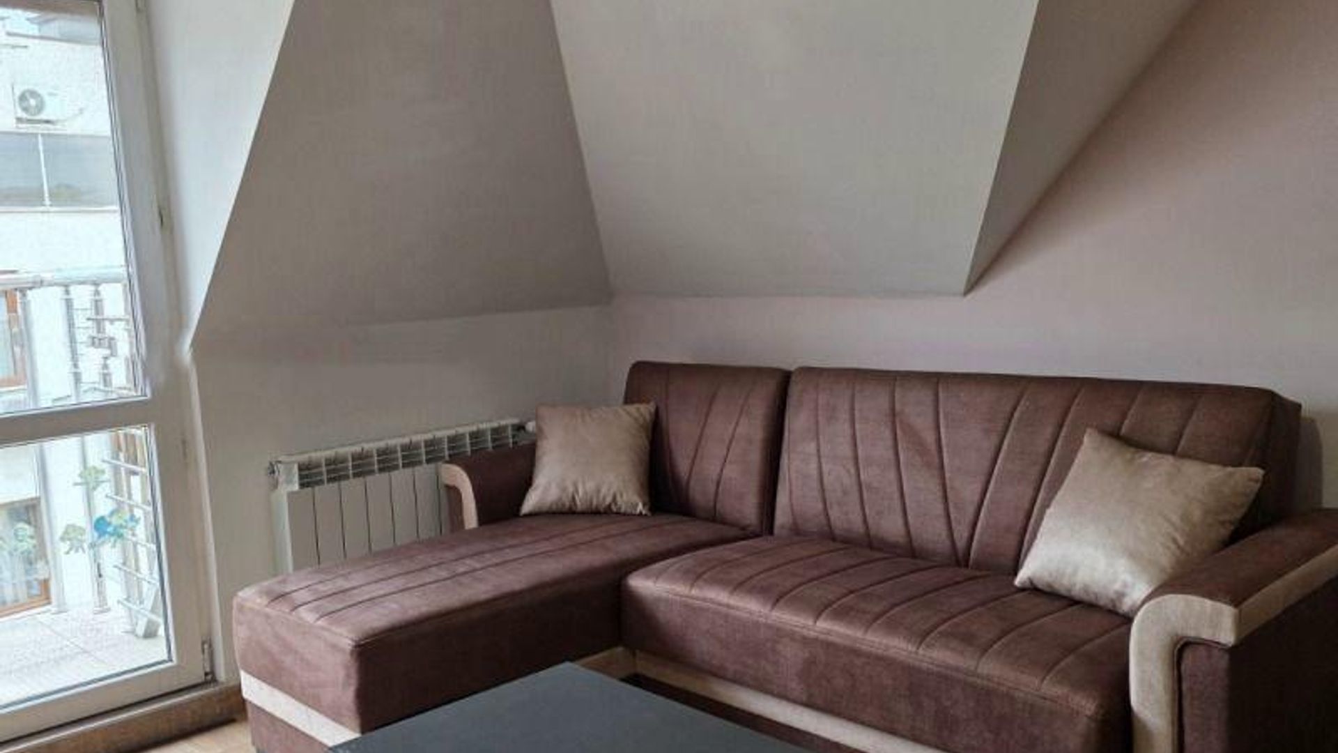<br/>Разпределението включва входно антре, баня с душ и отделна тоалетна, дневна с кухненски бокс, спалня и балкон. Обзаведен е с всички необходими мебели и електроуреди, отоплява се на газ и разполага с климатици за допълнителен комфорт.