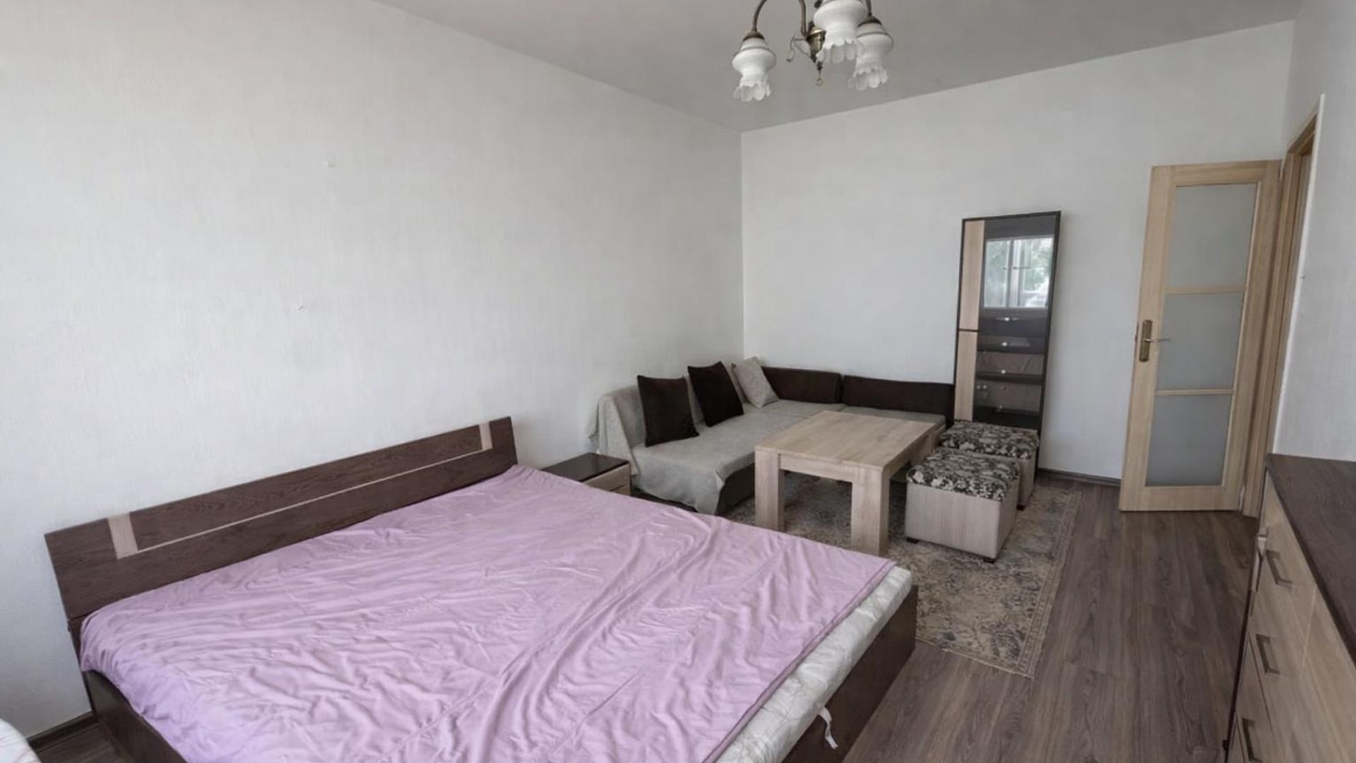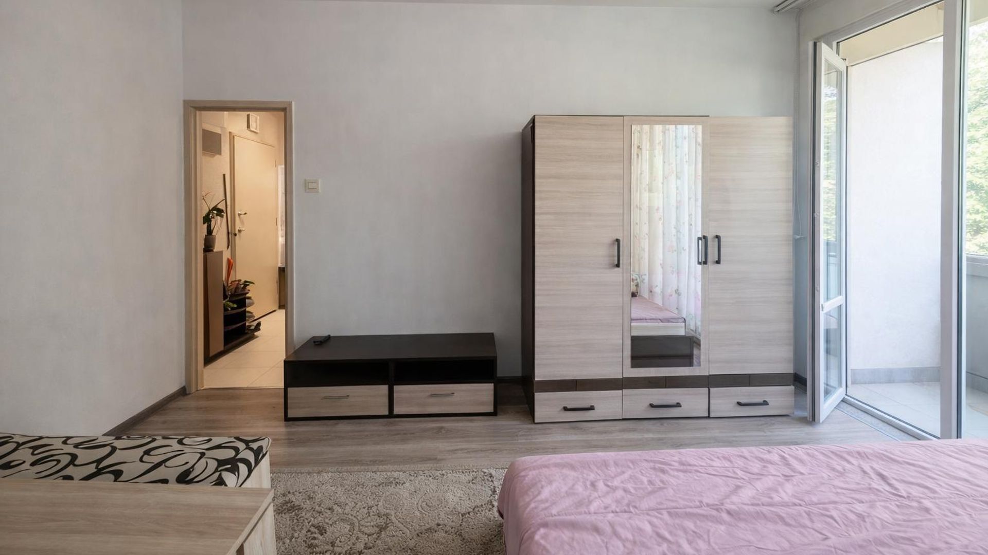 <br/>Разпределението включва просторна гарсониера, баня с тоалетна и тераса. Апартаментът е обзаведен и разполага с централизирано отопление (ТЕЦ).