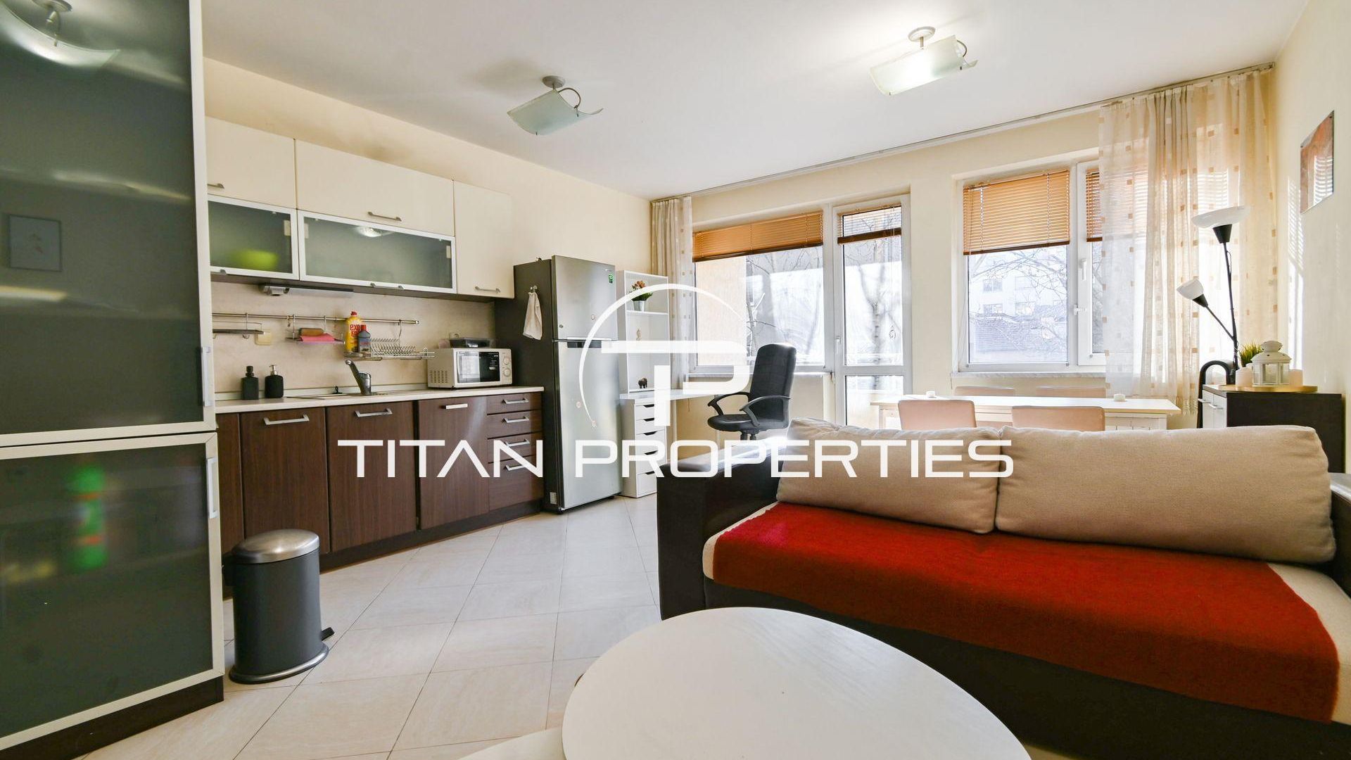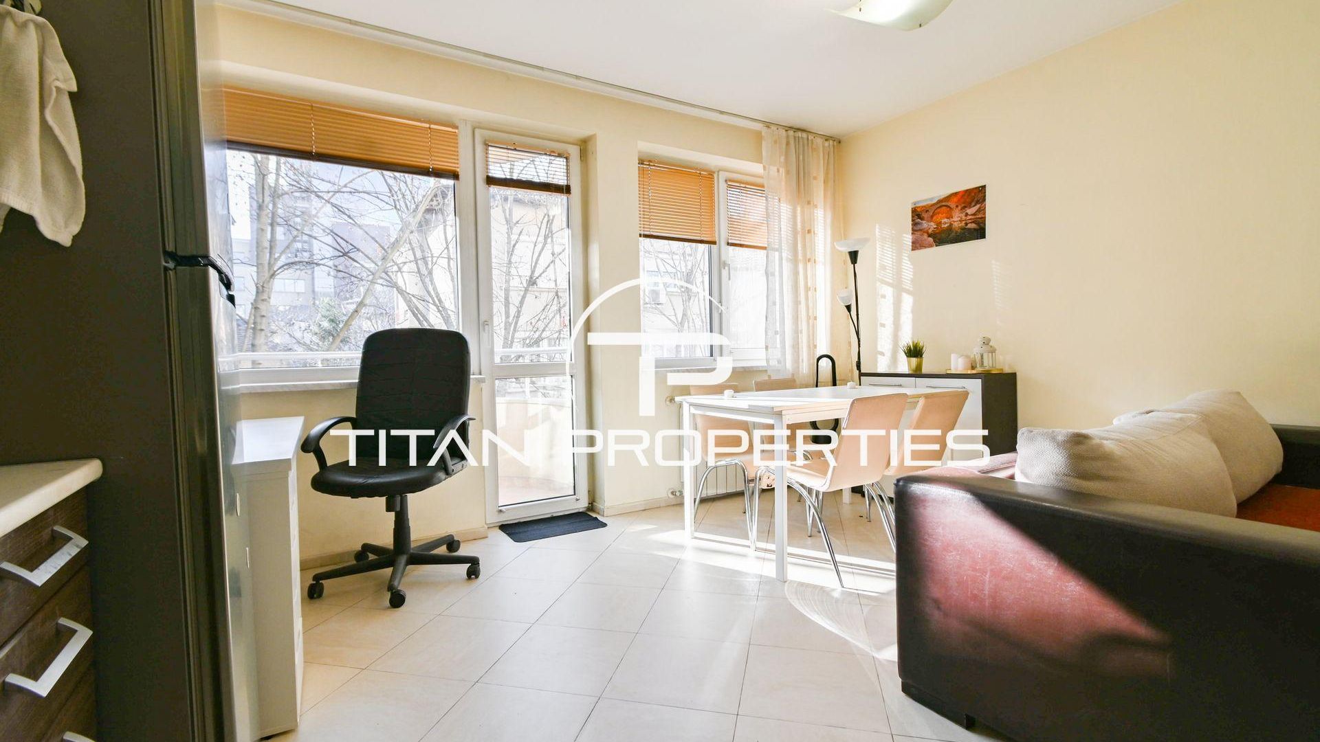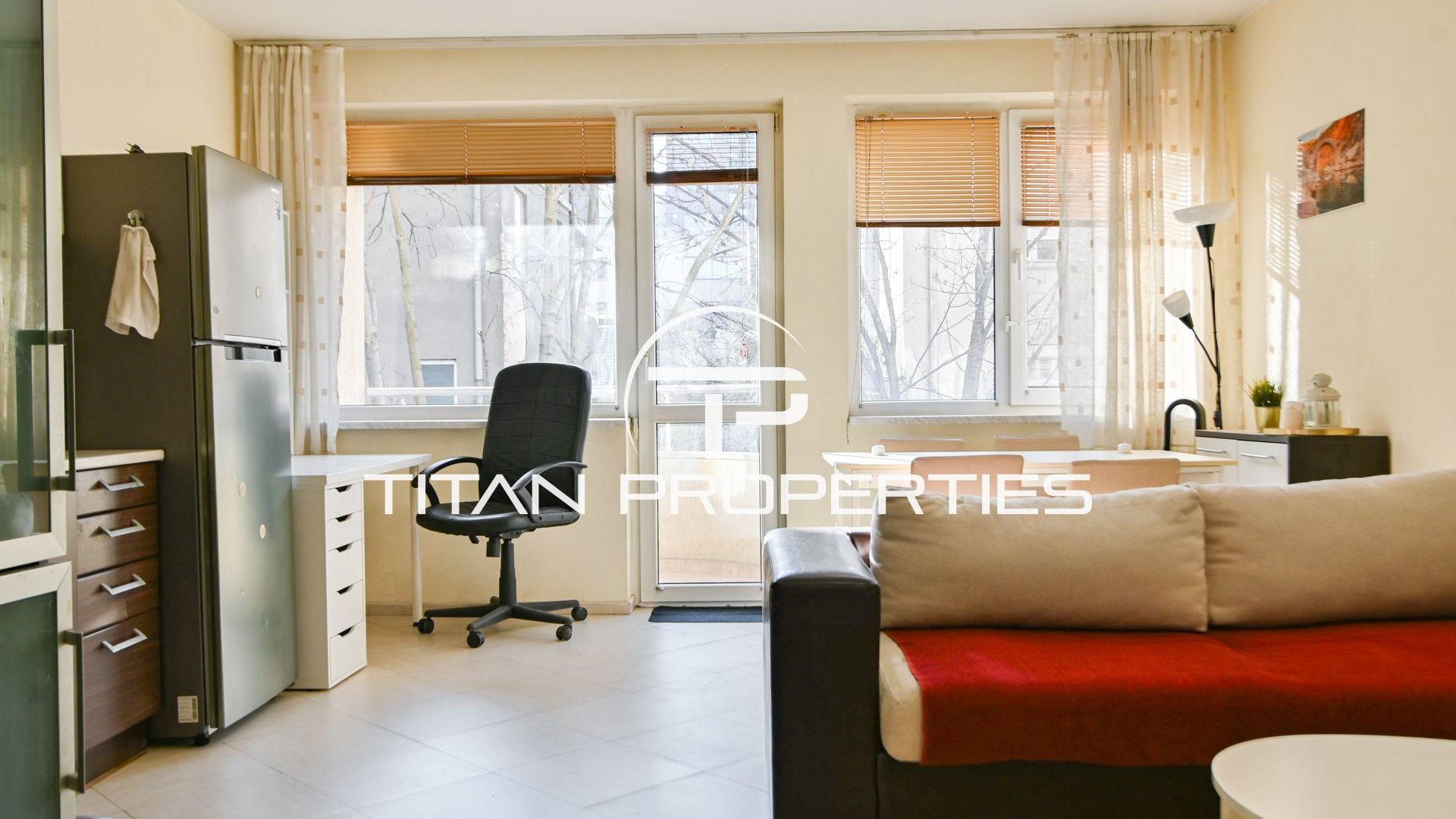 <br/>Титан Пропъртис - офис Младост с радост предлага на Вашето внимание двустаен апартамент под наем в кв. Център - пл.Македония, София. Жилището с площ 62 кв.м е разположено на 2-ри етаж в нова седеметажна сграда с южно изложение, което гарантира светлина през целия ден. Разпределението включва антре, просторна всекидневна с кухненски бокс и тераса, спалня, мокро помещение с автоматична пералня и сушилня, баня и тоалетна. Обзаведен и с отопление на ТЕЦ.