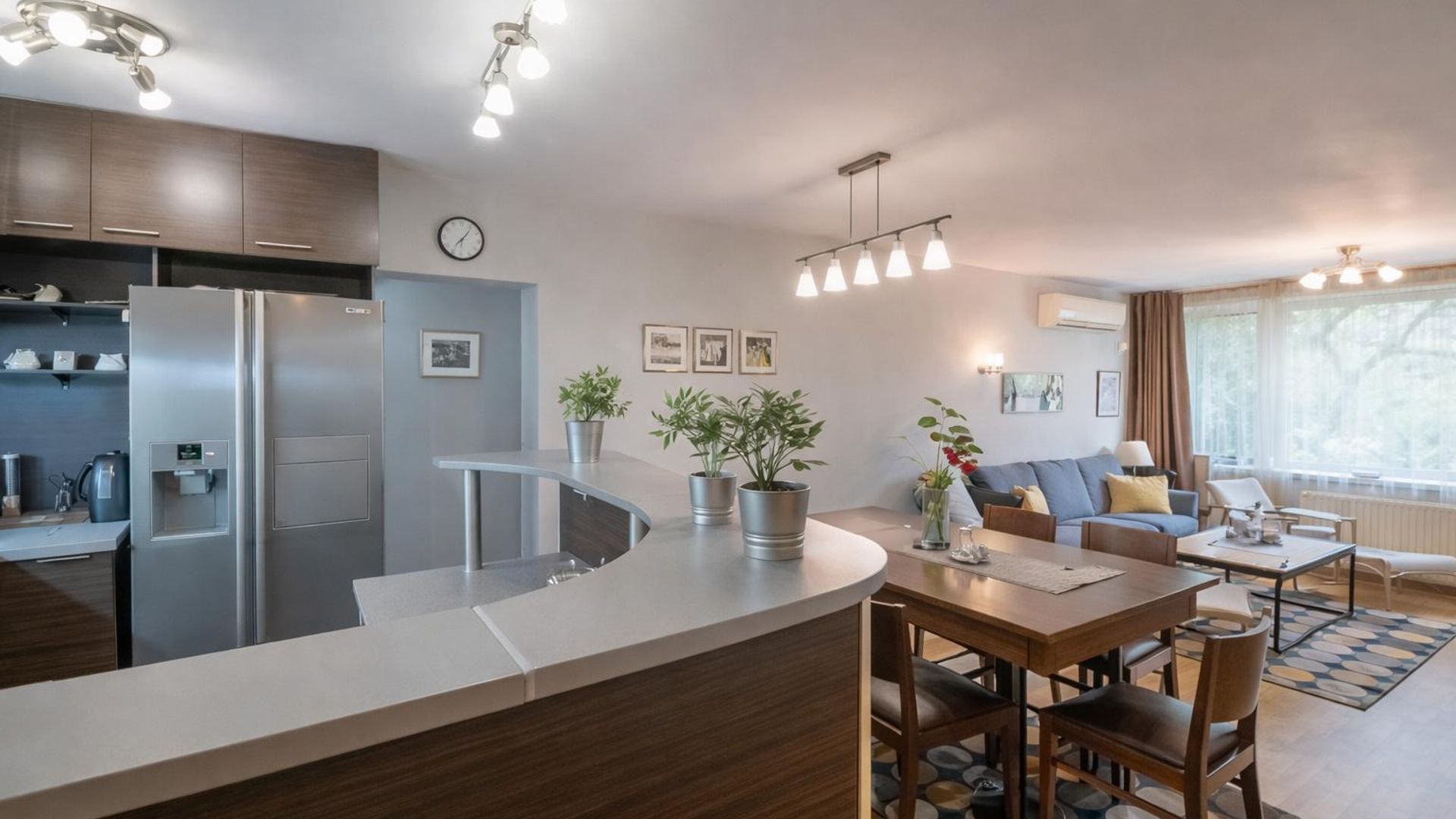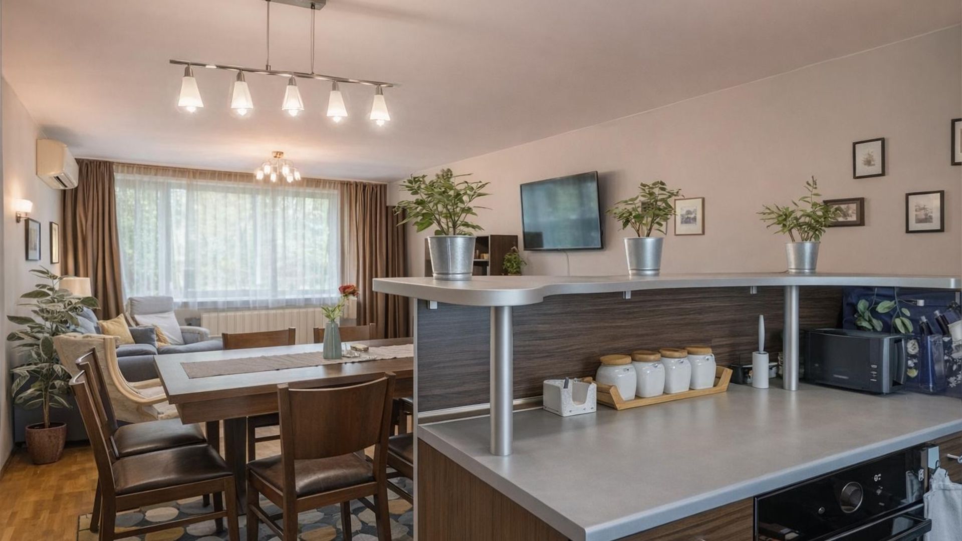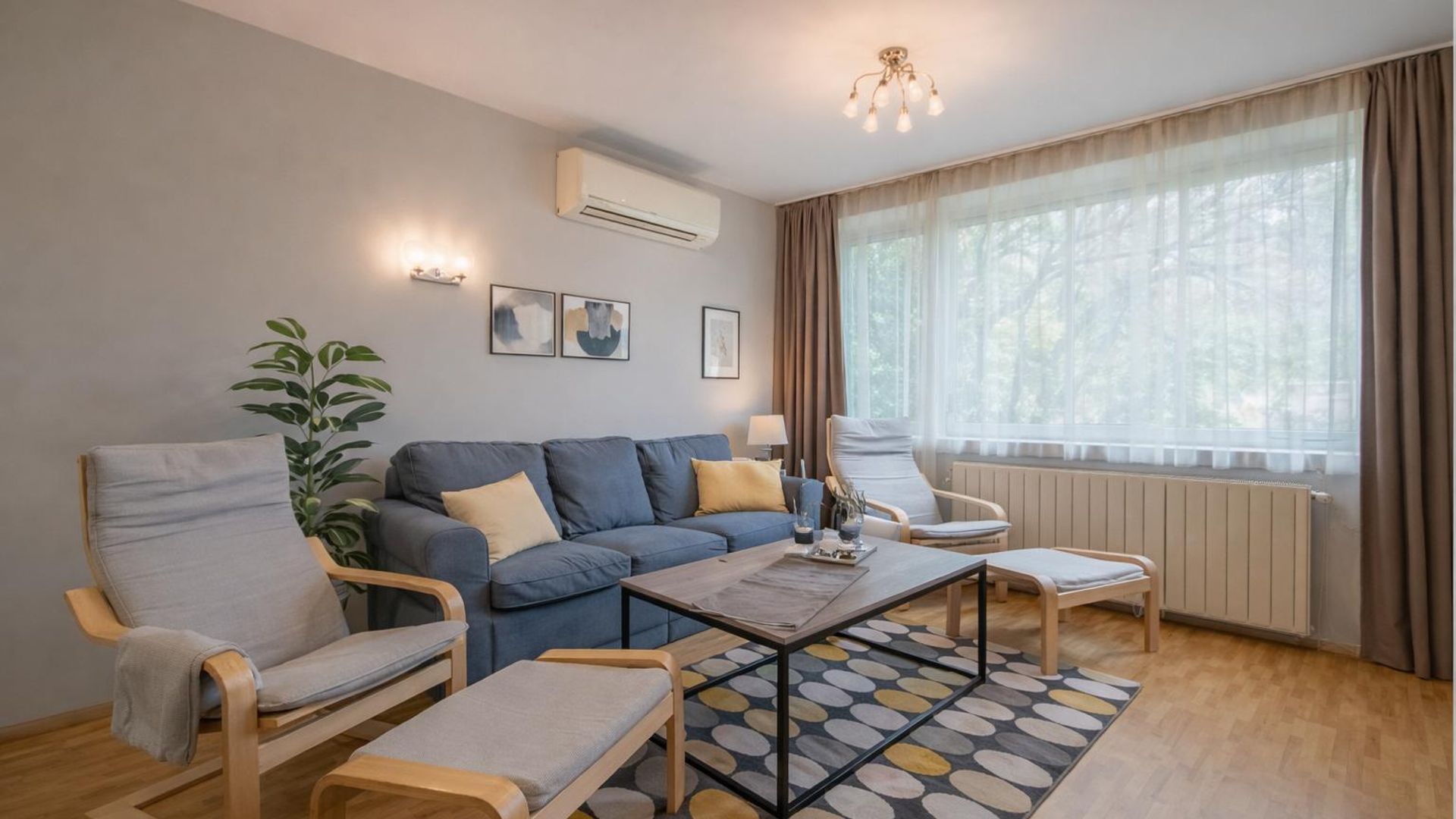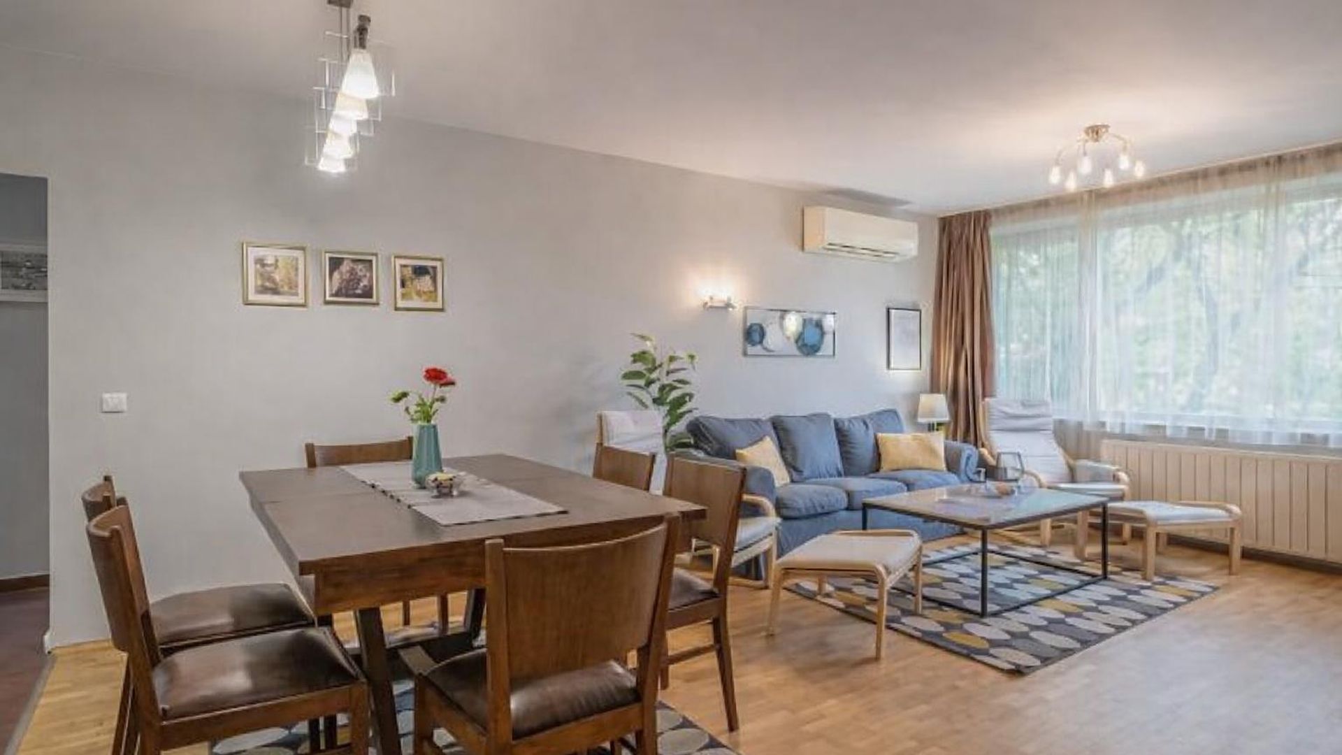 <br/>Три самостоятелни спални осигуряват достатъчно уединение, а две бани с тоалетна и отделна тоалетна добавят удобство и практичност. Апартаментът е обзаведен и разполага с централно отопление на ТЕЦ. Месечният наем е 1350 EUR. Особен акцент е близостта до спирки, улесняваща придвижването из града.