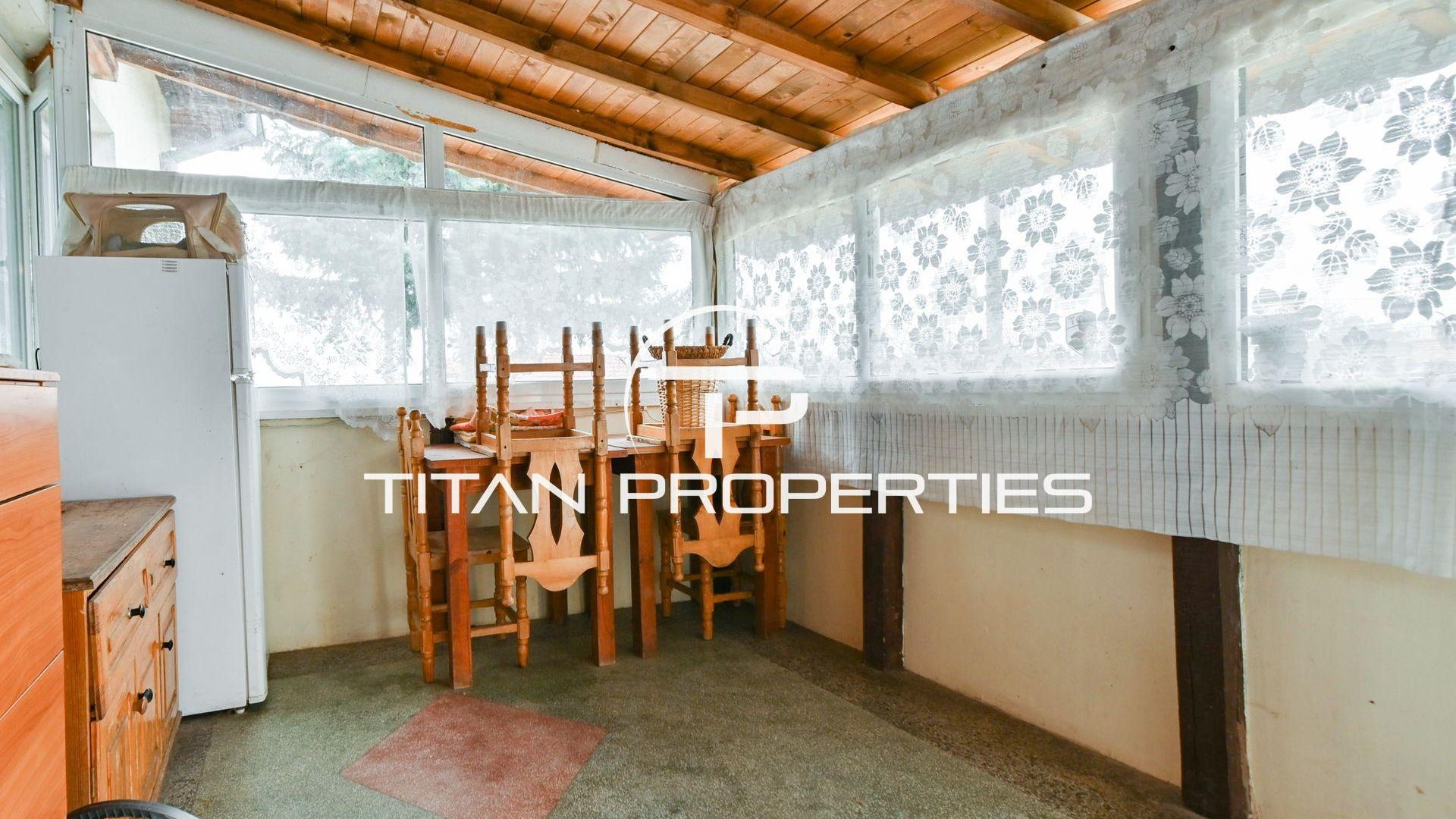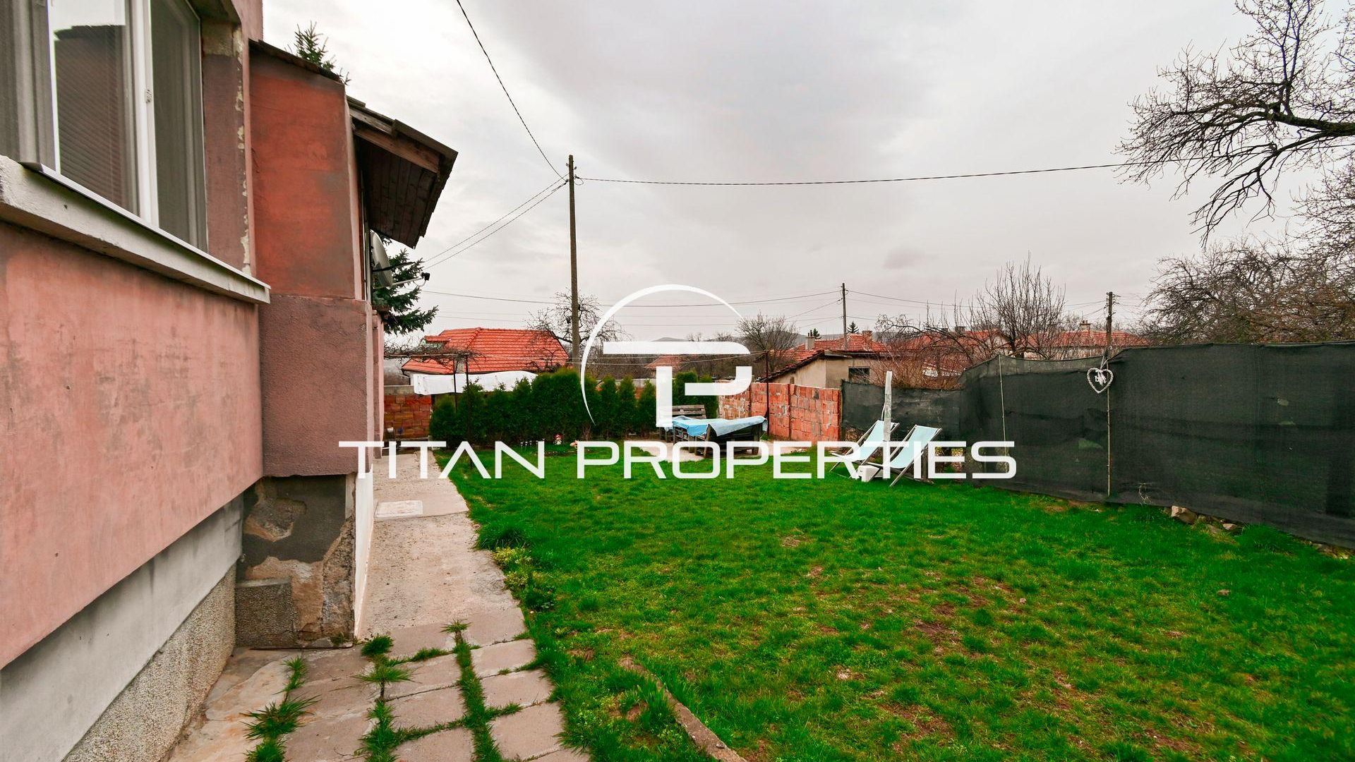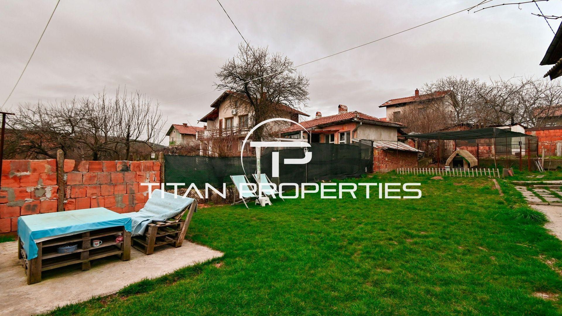 <br/>Титан Пропъртис офис - Бул. България с радост предлага на Вашето внимание двуетажна къща за продажба в с. Храбърско, област София. Със застроена площ 100 кв.м. е изградена от тухла преди 2000 г. и предлага източно, западно, северно и южно изложение. На първия етаж ви посреща входно антре, просторна всекидневна с кухненски бокс, баня с тоалетна и детска спалня. Родителската спалня и детската стая споделят обща тераса. Къщата разполага с двоен гараж и допълнително помещение за механа. В двора е обособена зона за барбекю и стара малка каменна къща с две помещения в подпокривното пространство за воден резервоар. Имотът се предлага обзаведен, а отоплението е с котле на дърва, има и климатик.