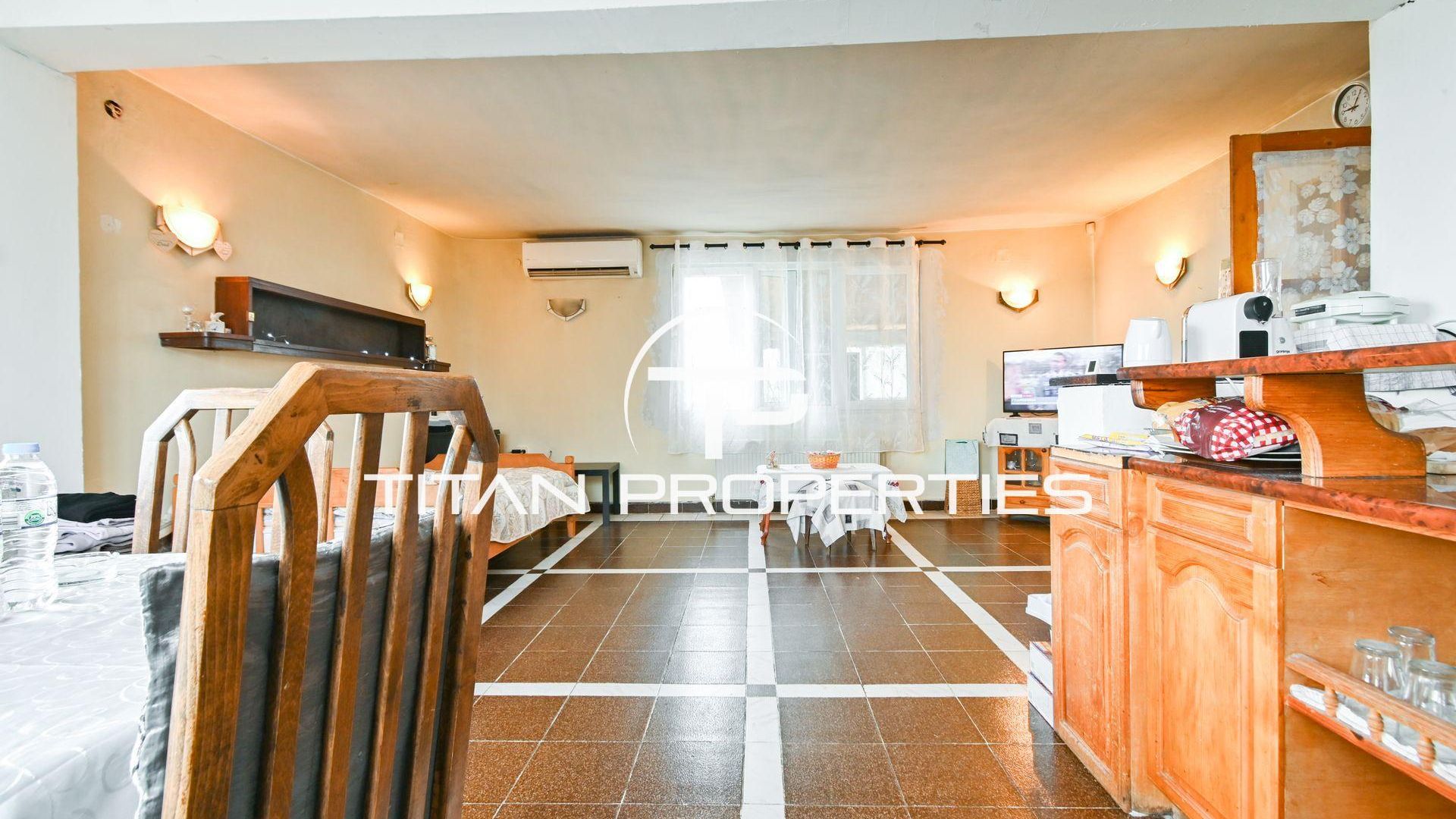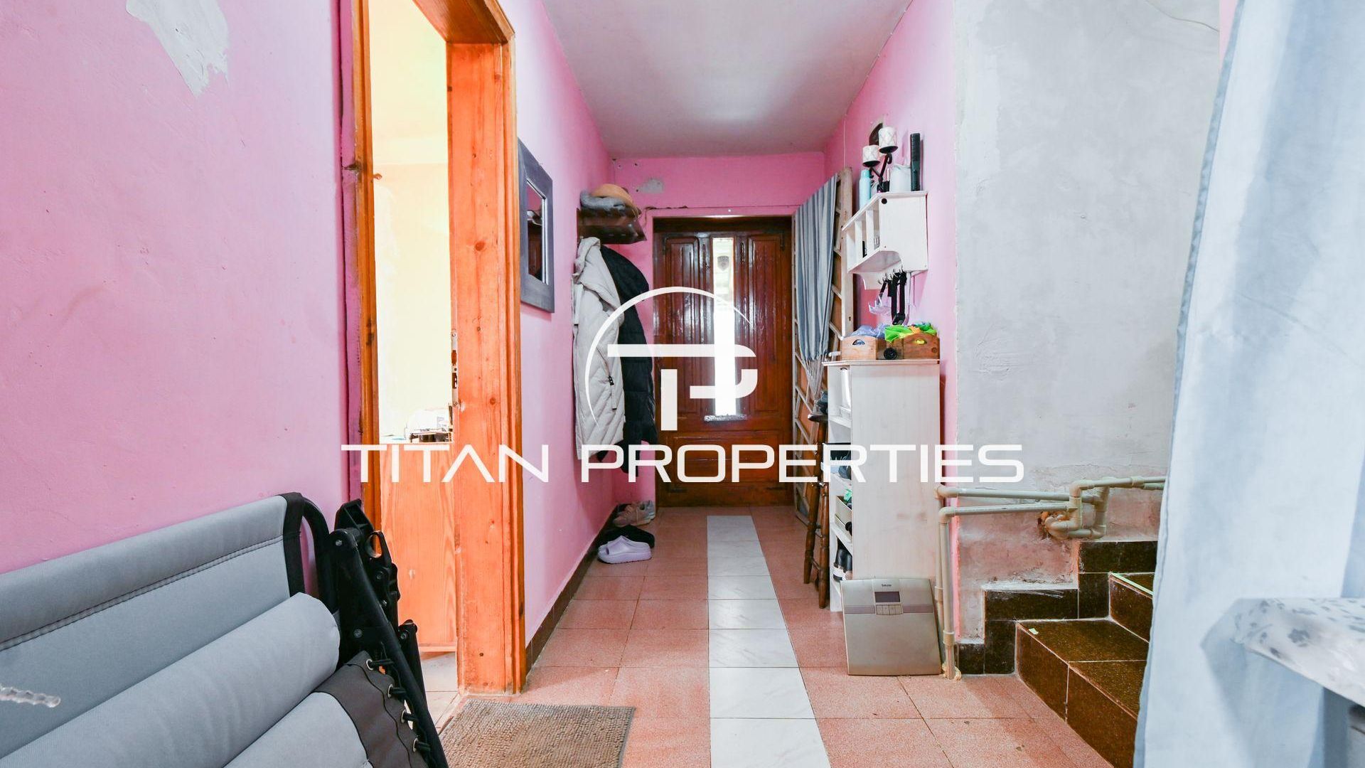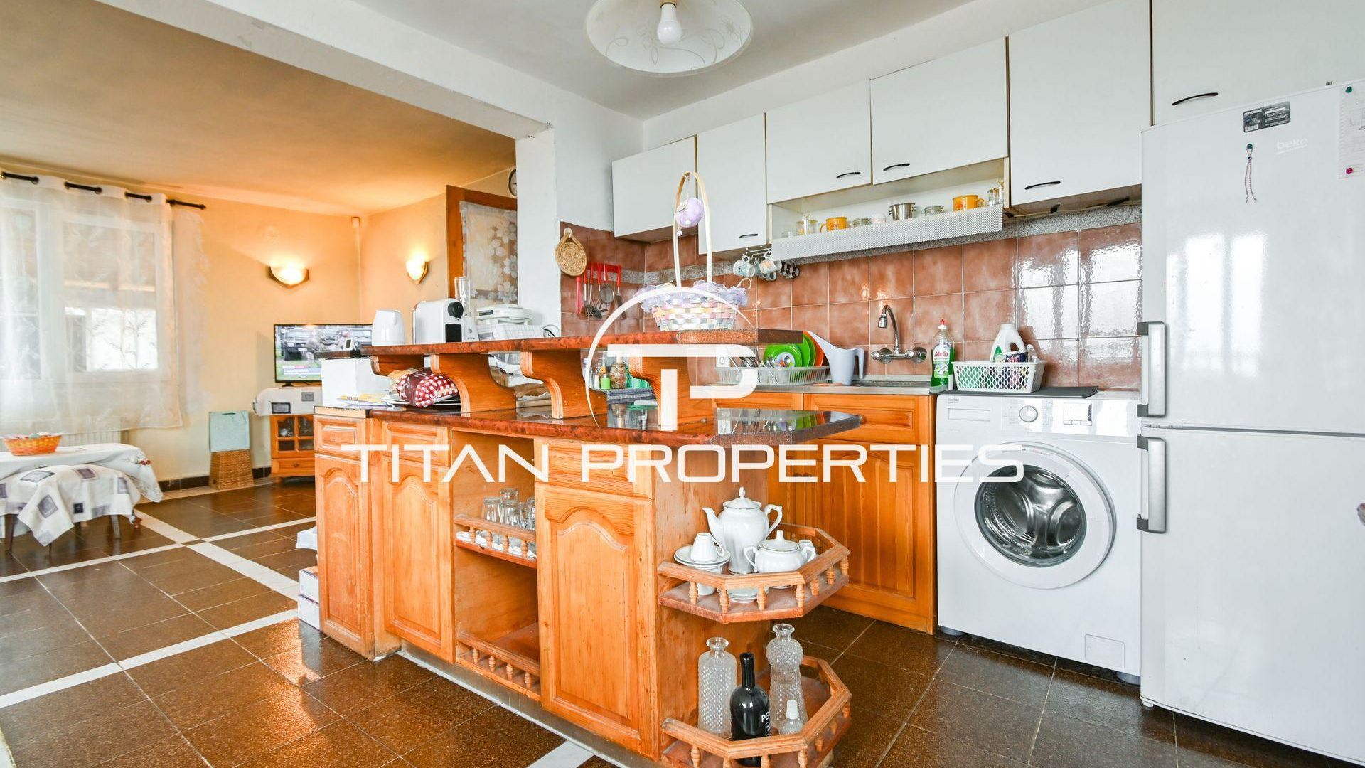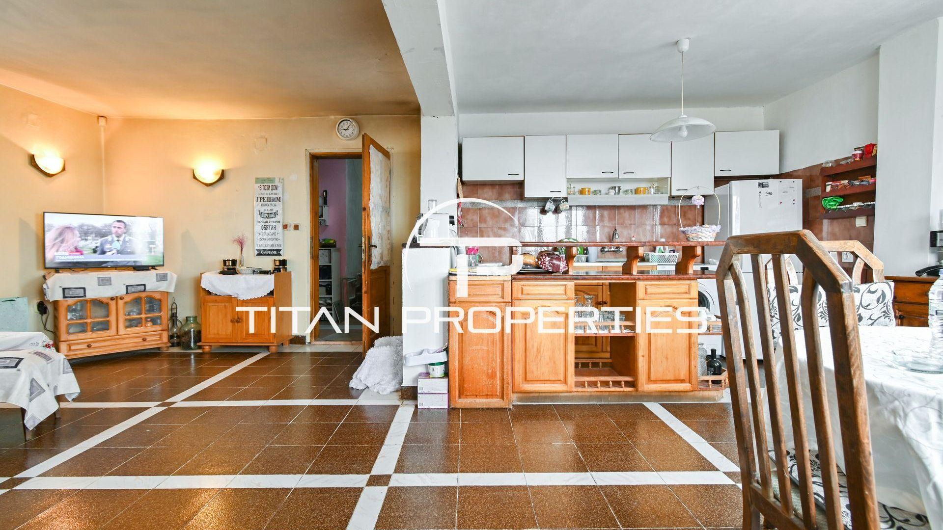 <br/>Титан Пропъртис офис - Бул. България с радост предлага на Вашето внимание двуетажна къща за продажба в с. Храбърско, област София. Със застроена площ 100 кв.м. е изградена от тухла преди 2000 г. и предлага източно, западно, северно и южно изложение. На първия етаж ви посреща входно антре, просторна всекидневна с кухненски бокс, баня с тоалетна и детска спалня. Родителската спалня и детската стая споделят обща тераса. Къщата разполага с двоен гараж и допълнително помещение за механа. В двора е обособена зона за барбекю и стара малка каменна къща с две помещения в подпокривното пространство за воден резервоар. Имотът се предлага обзаведен, а отоплението е с котле на дърва, има и климатик.