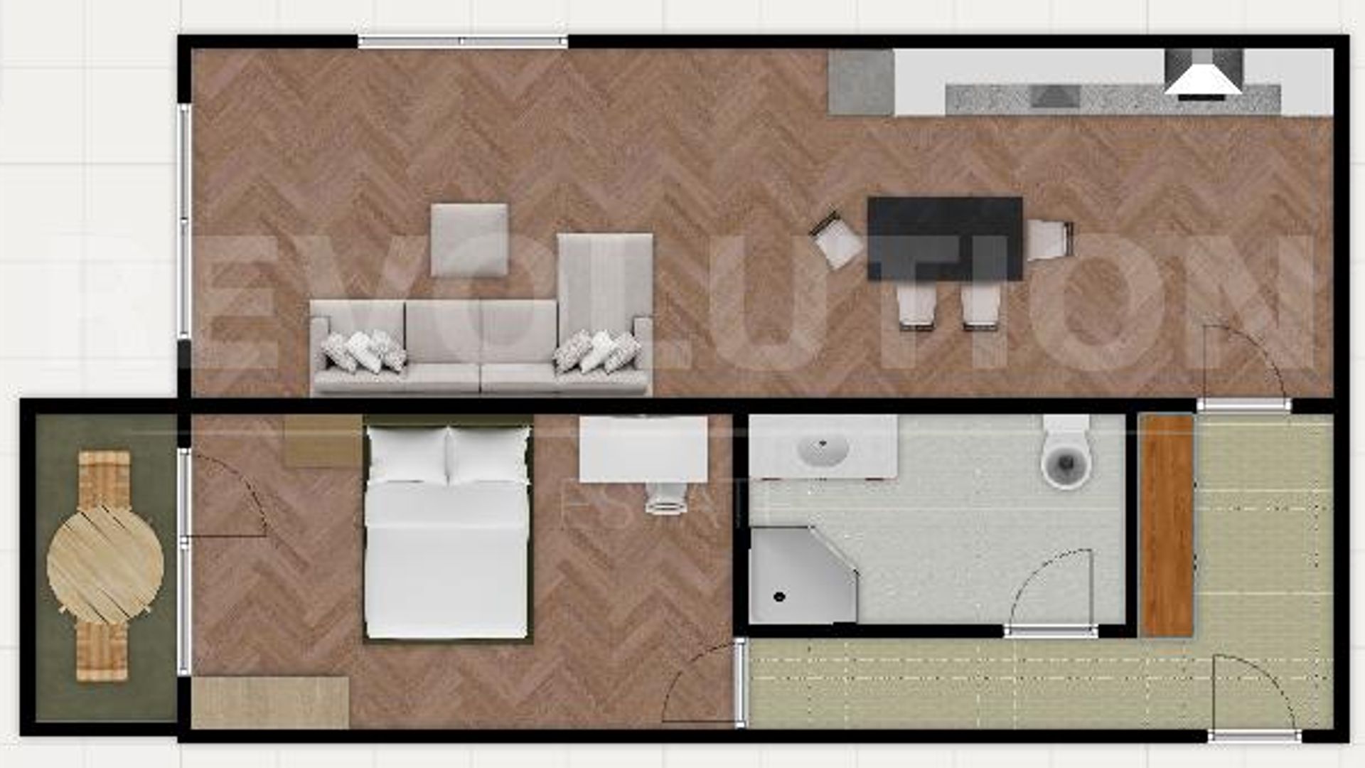 <br/>- Разпределение: входно антре, хол с кухненски бокс, спалня, баня с тоалетна и тераса
