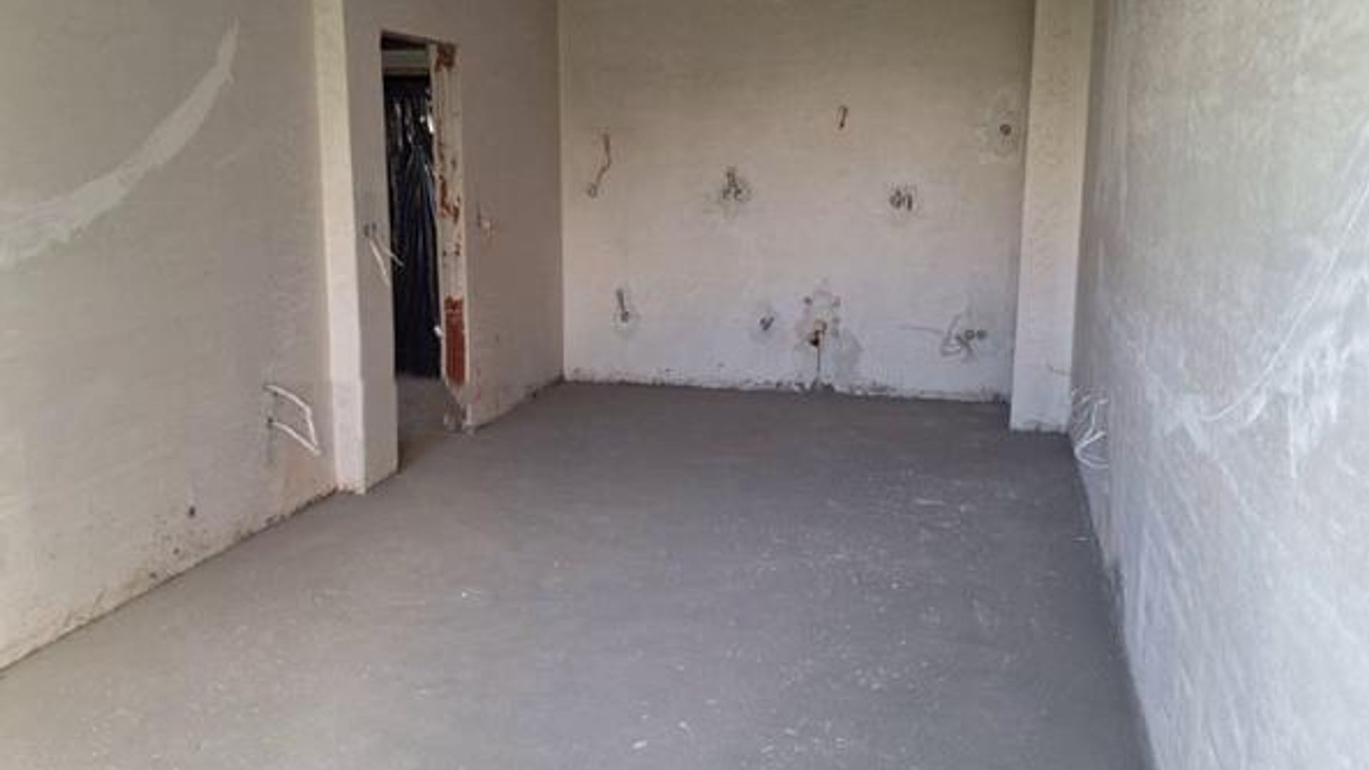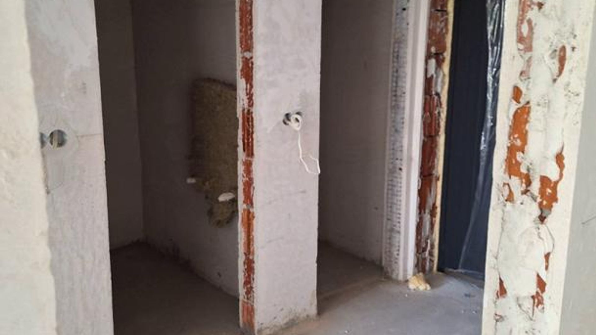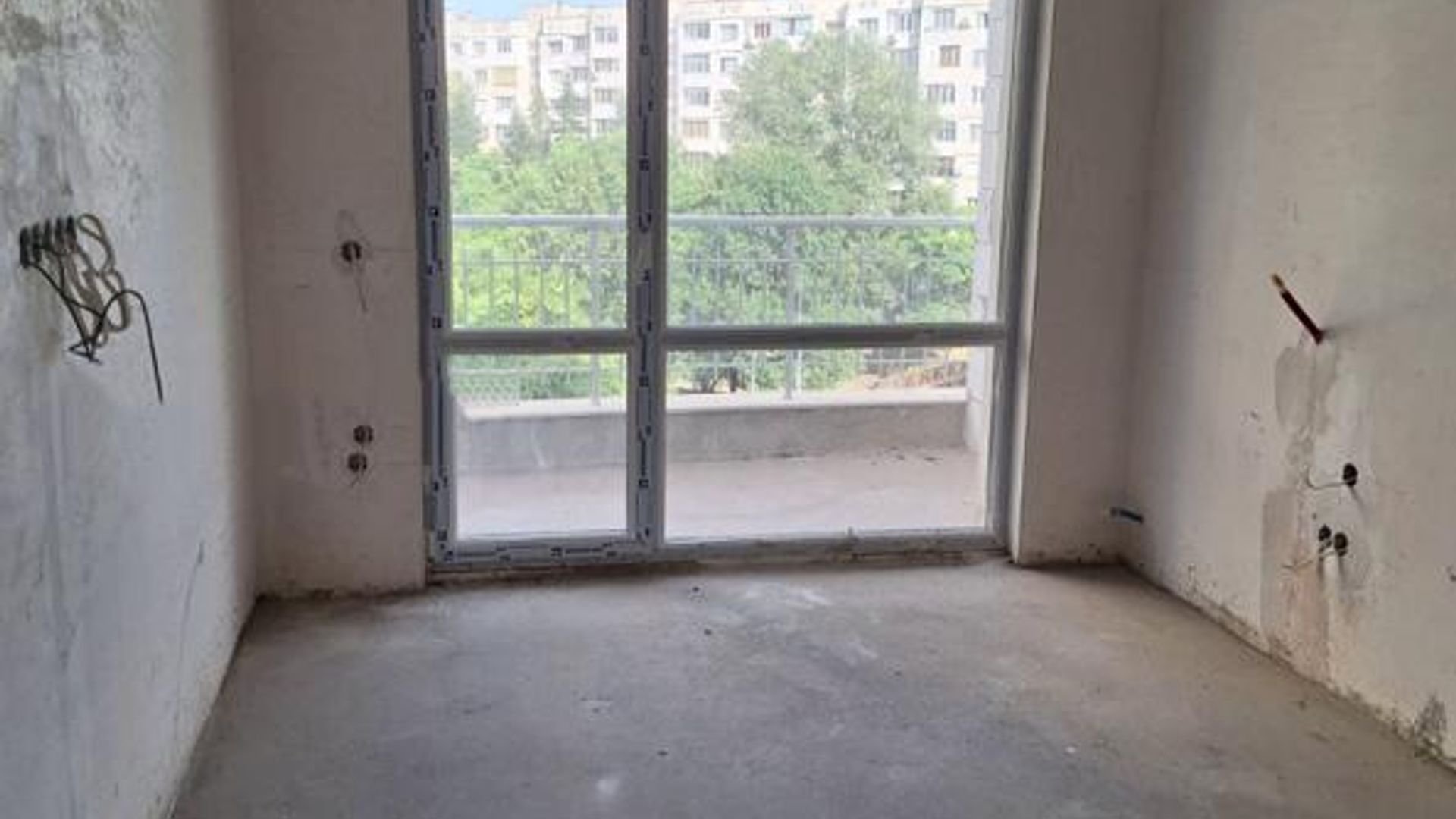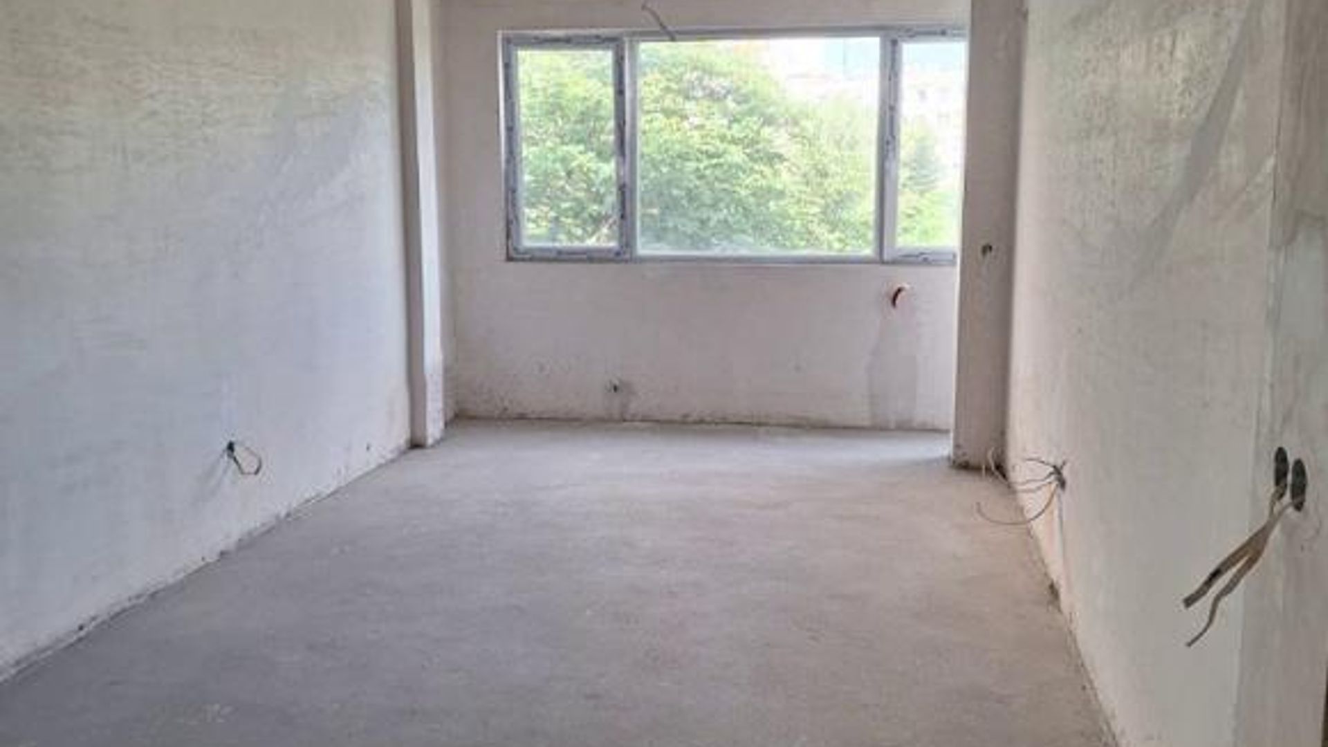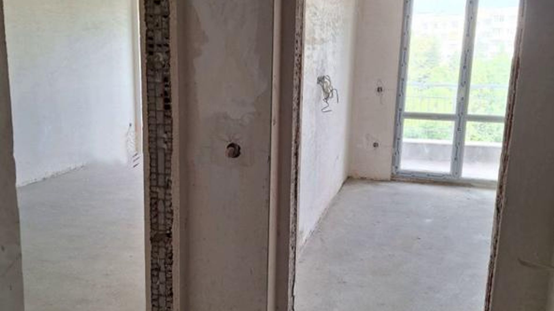 <br/>Разпределението включва коридор с два санитарни възела, просторен хол с кухненски бокс и тераса, както и голяма спалня. Отоплението е на ТЕЦ, а имотът се предлага на шпакловка и замазка, готов за завършване по индивидуален вкус.