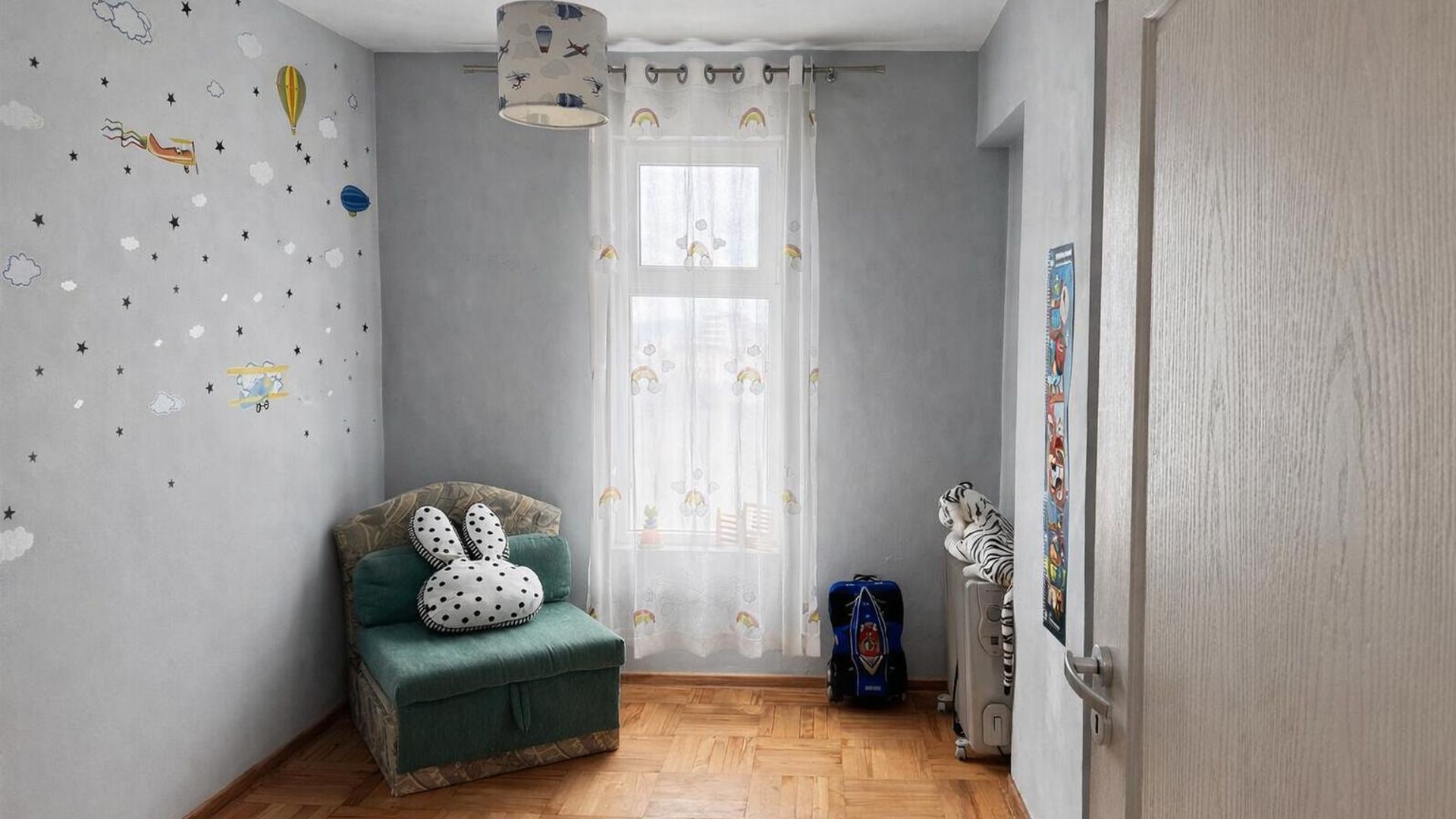 <br/>Имотът е ситуиран на 4-ти етаж и разполага с площ от 85 кв.м разгърната в следното разпределение: коридор, перално помещение, голяма и слънчева спалня, детска стая, баня с тоалетна, кухня, хол, тераса