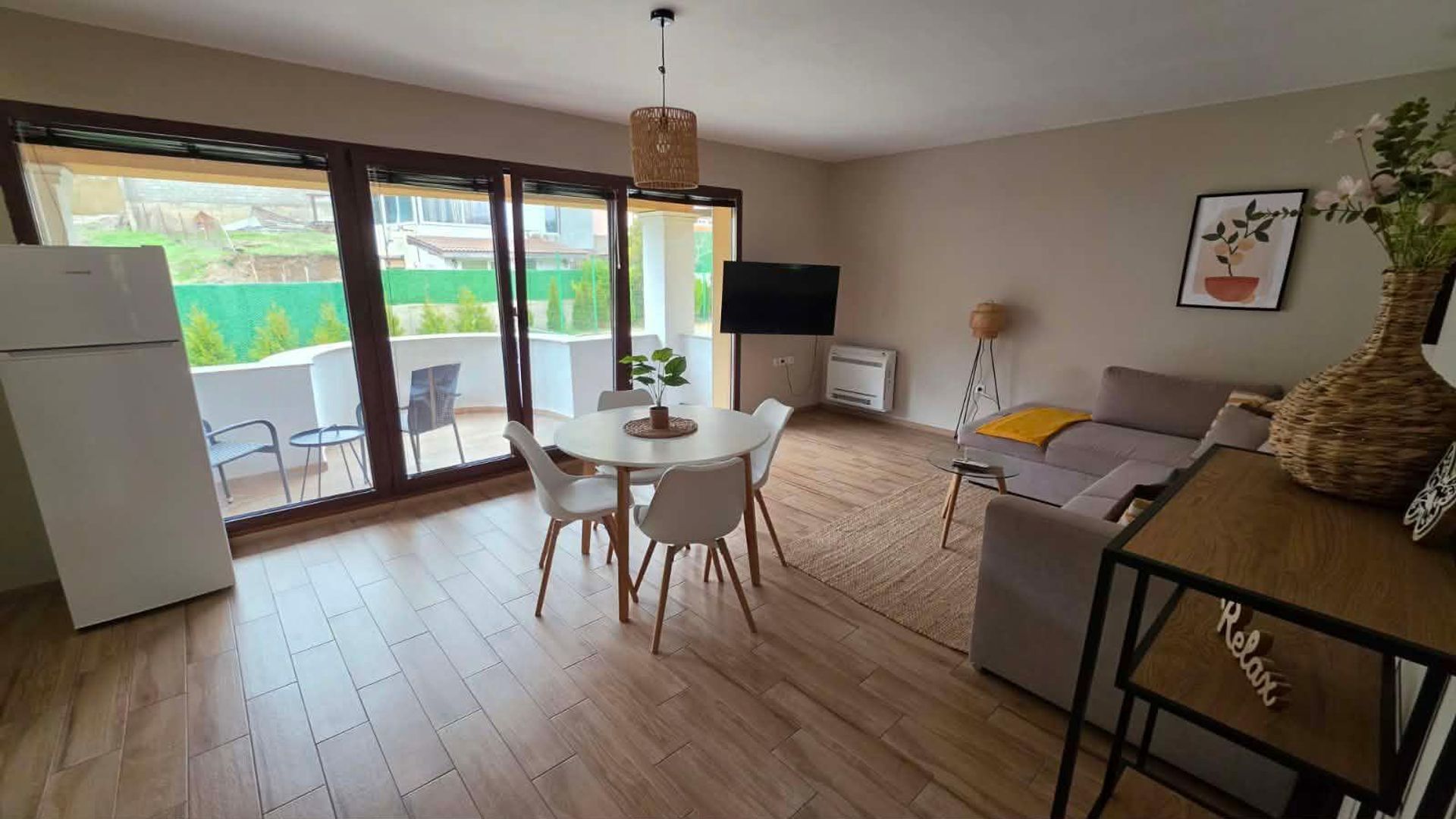 <br/>Апартамента е ситуиран на 1-ви етаж и разполага с площ от 65 кв.м., разгърнати по следния начин: дневен тракт, спалня, баня с тоалетна, коридор и тераса.